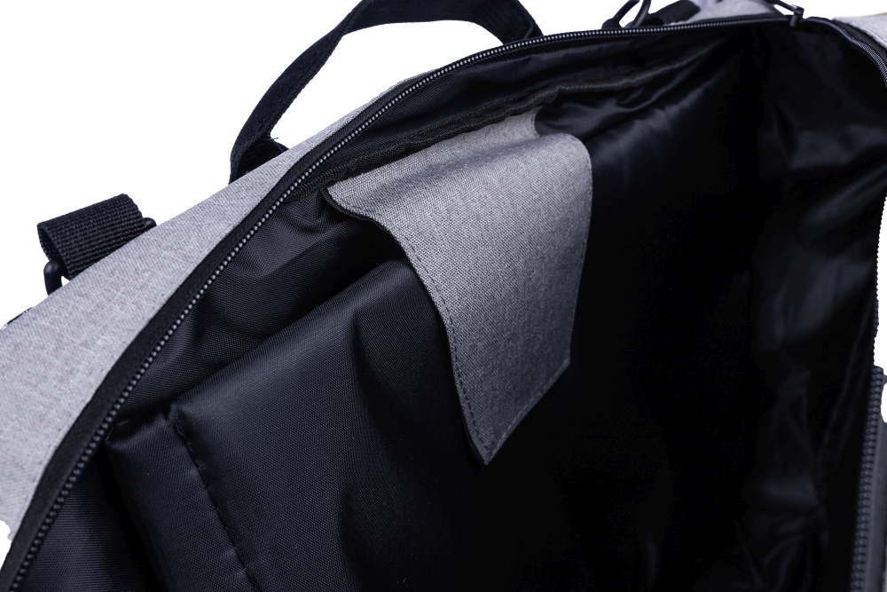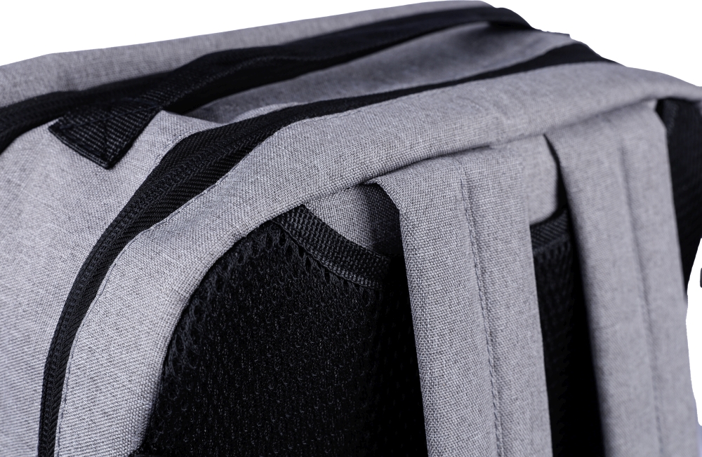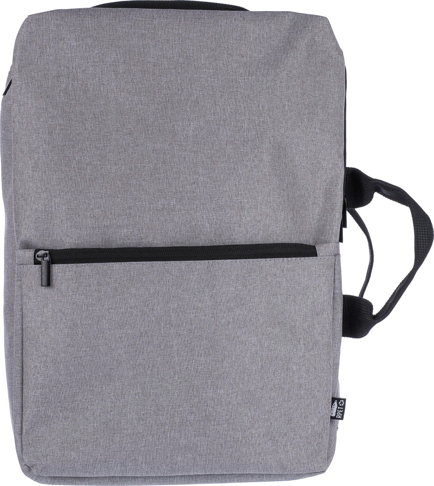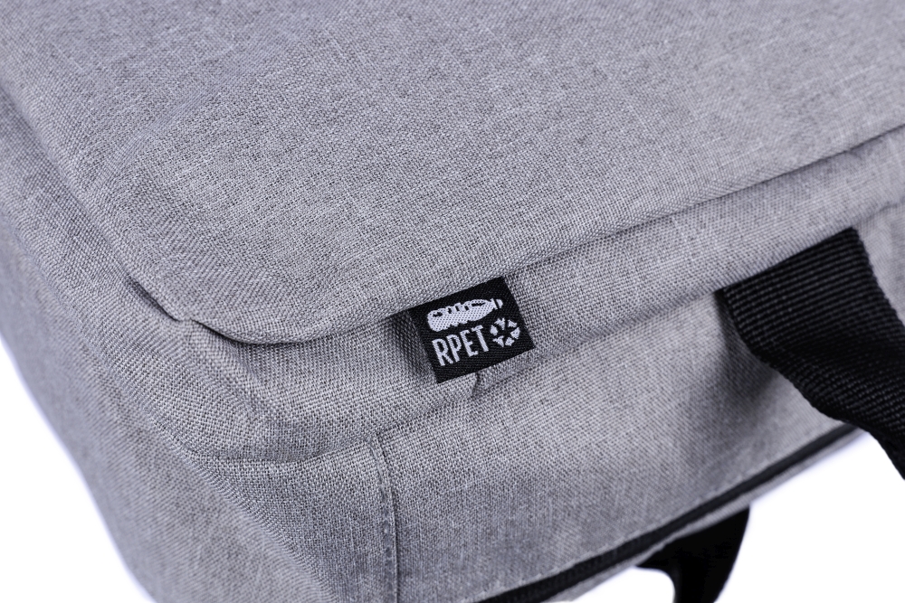 rPET polyester (300D) backpack and laptop bag (15 inch) with 210D lining inside. Cabin-proof. With carrying loop on top, adjustable shoulder straps, and two carrying handles on the side. Adjustable straps tuck behind the padding for a carry function with side handles. Velcro laptop compartment and small zippered compartment. With ventilated padded backing. Carrying weight approx. 8 kg. Includes rPET label. Dimensions: 28 x 40,5 x 11 cm