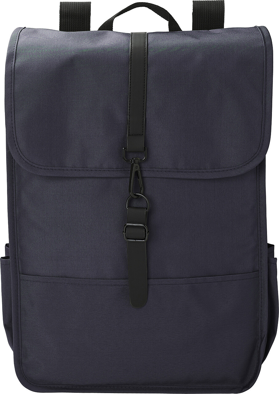 RPET Polyester (300D) flap backpack. Two bottle pockets on the side. One large compartment. With black PU strap with closing buckle.