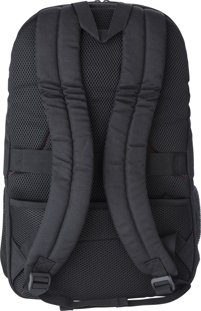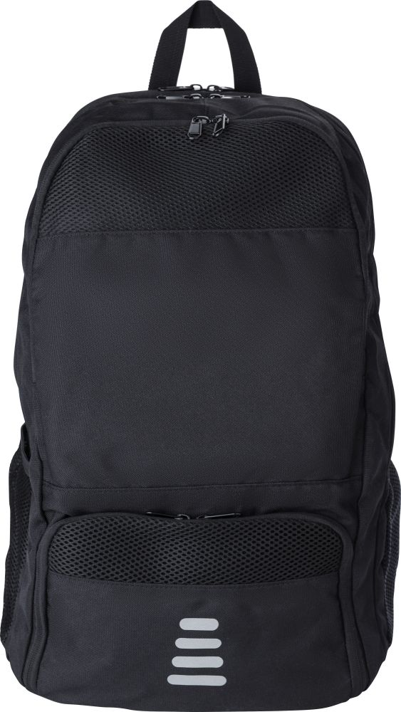 RPET polyester multi-functional backpack. 210D lining and RPET 600D outside. Function include: racket pocket, anti-theft pocket, shoe pocket, laptop pocket, bottle compartments. The bag has padded adjustable straps and is water repellent (recycled coating).