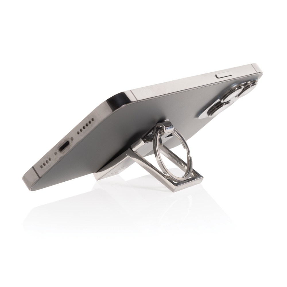 Luxury keychain with phone stand made with RCS recycled zinc alloy. Total recycled content: 86% based on total item weight. RCS certification ensures a completely certified supply chain of the recycled materials. Packed in paper bag. Dimensions: 4.5 x 2.9