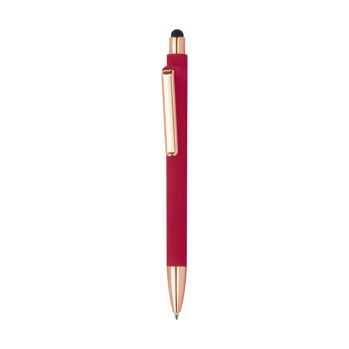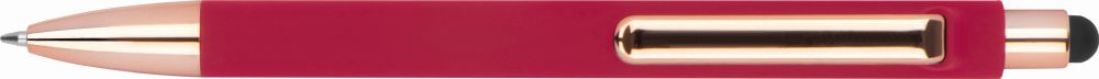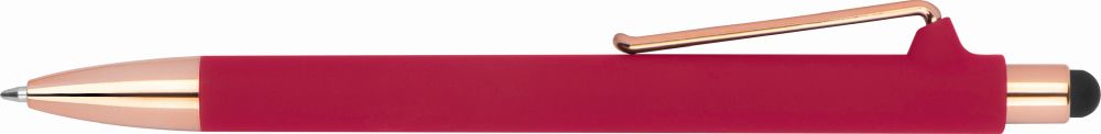 Rubberised pen with rose gold-coloured applications, blue refill, extravagant clip and touch function. Your logo is printed to the right of the clip.