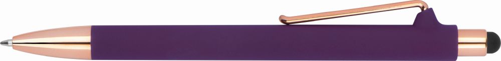 Rubberised pen with rose gold-coloured applications, blue refill, extravagant clip and touch function. Your logo is printed to the right of the clip.