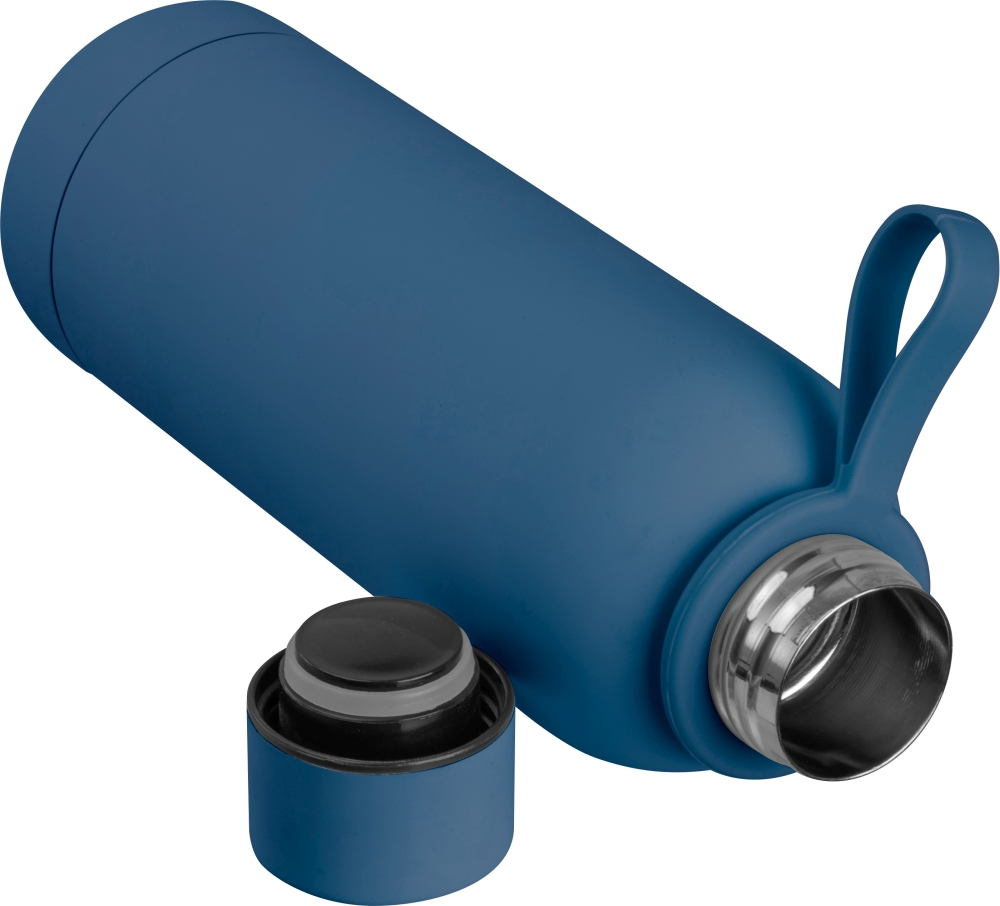 Large drinking bottle with rubberised outer coating and 700 ml capacity. The vacuum insulation keeps drinks hot and cold for a long time. Practical lid with screw cap and loop. We will engrave your logo on the outside. Dimensions: