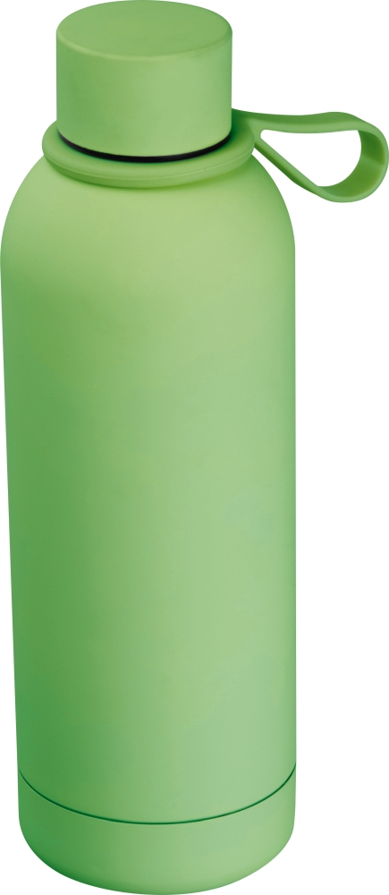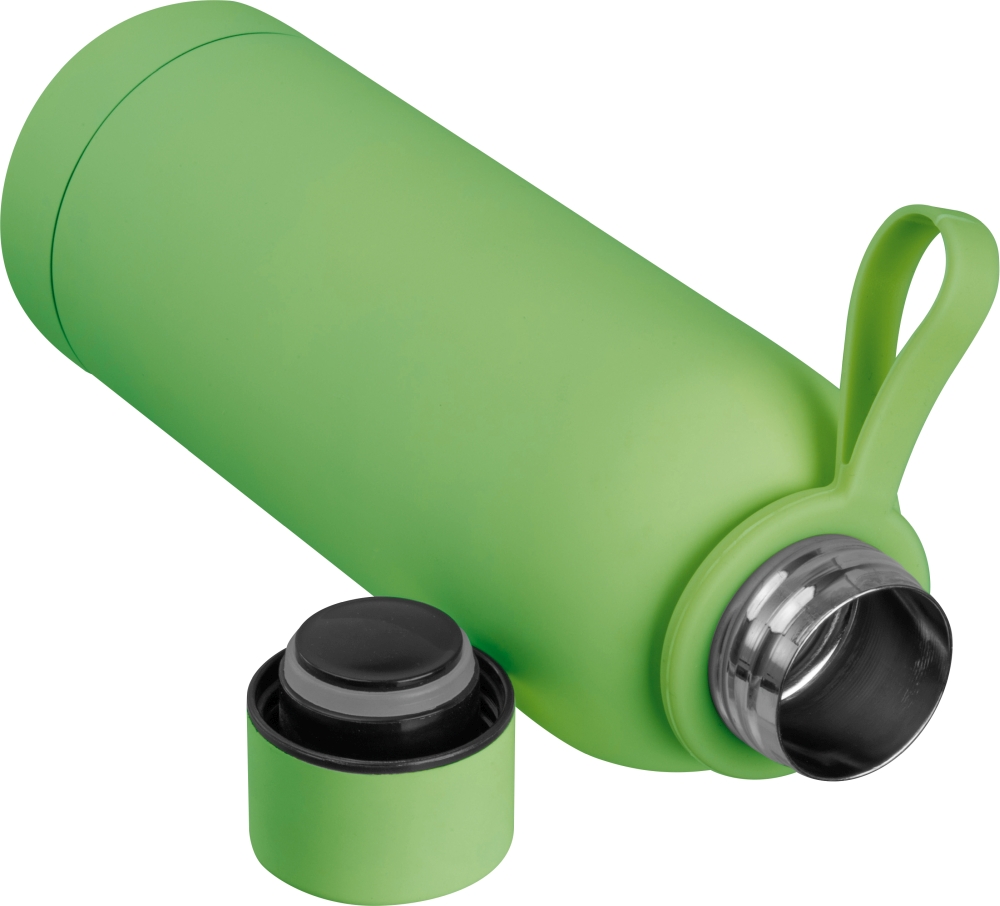Large drinking bottle with rubberised outer coating and 700 ml capacity. The vacuum insulation keeps drinks hot and cold for a long time. Practical lid with screw cap and loop. We will engrave your logo on the outside. Dimensions: