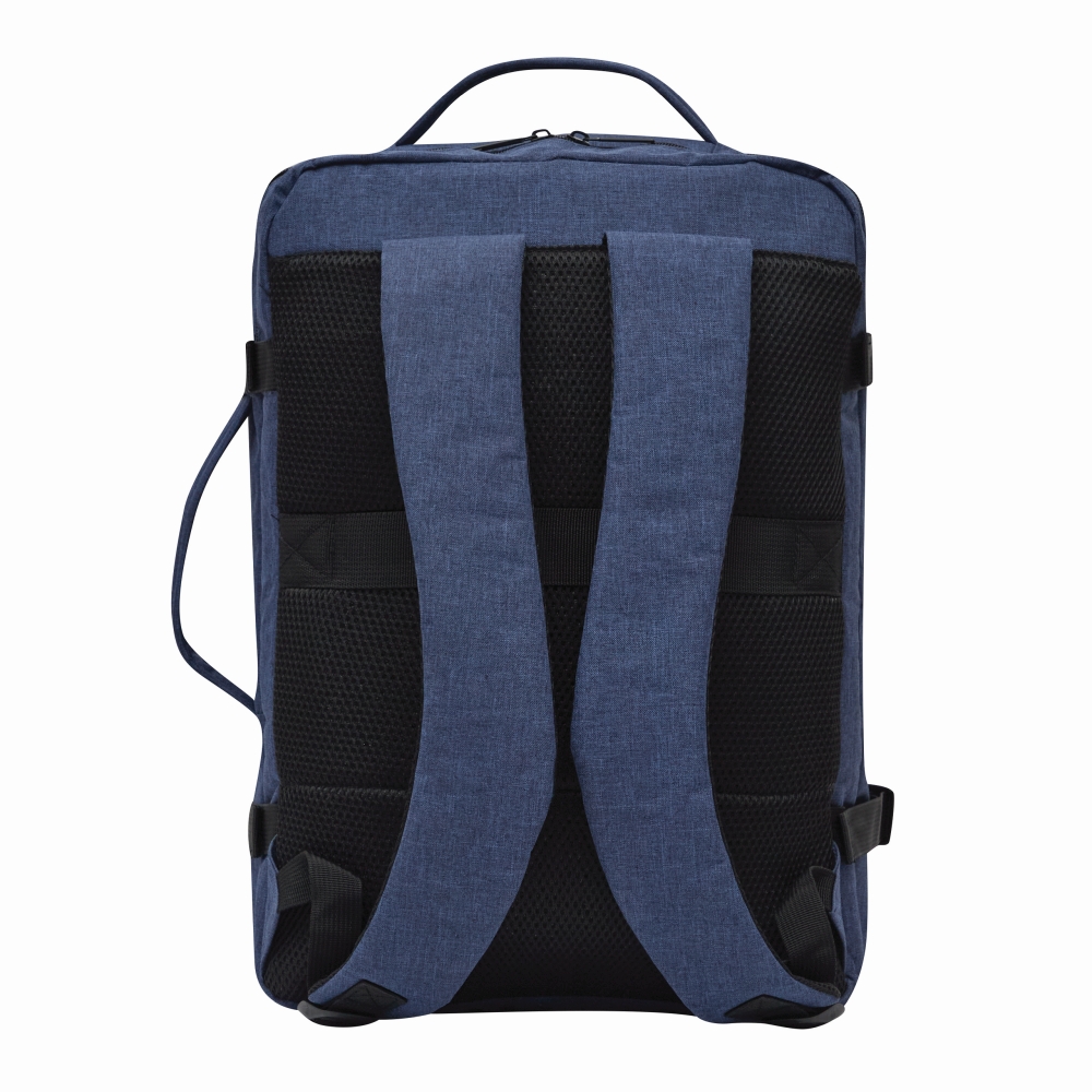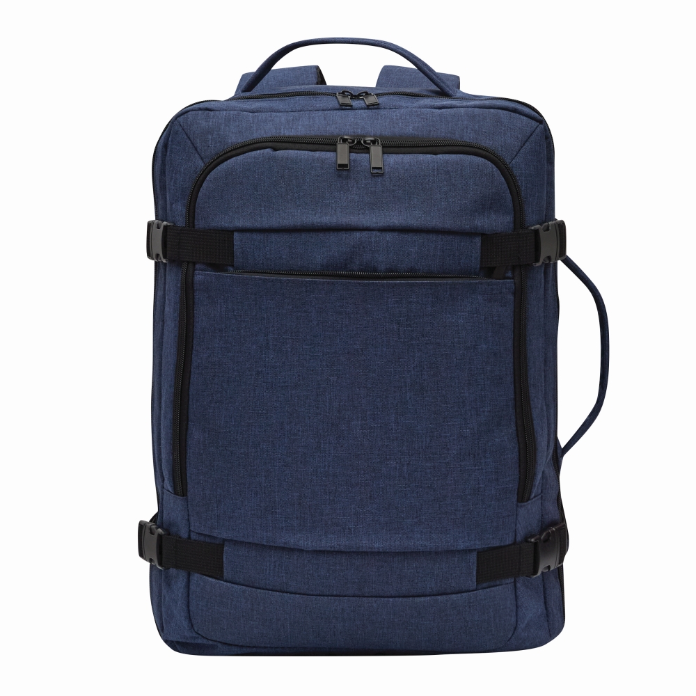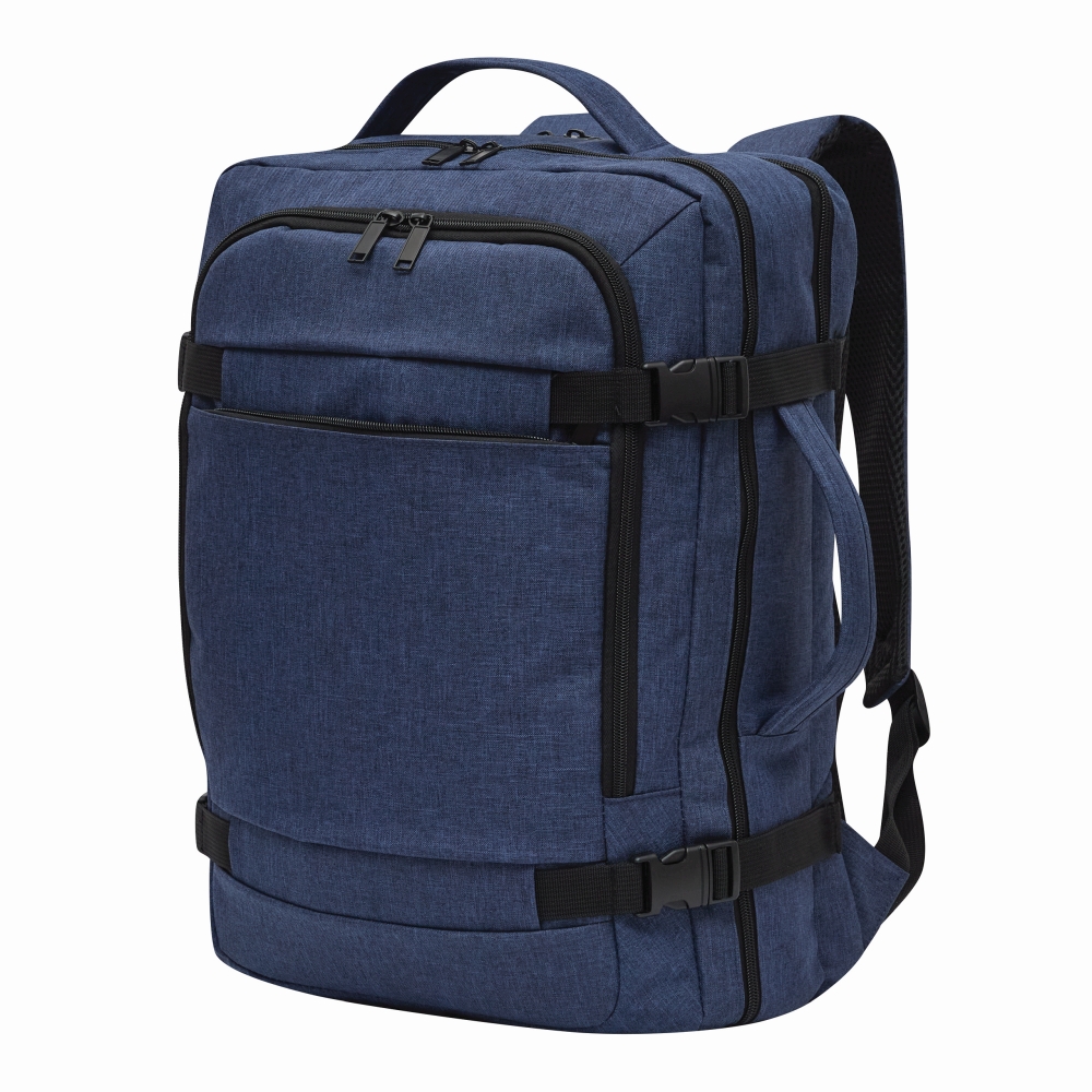 2 front zippered compartments, one with organizer (3 slip pockets, 2 pen loops), 1 large padded main compartment with strap and zipper, 1 padded laptop compartment with zipper, 1 reinforced top and side grab handle, padded ergonomic shoulder straps and padded back panel with case for telescopic handle, 2 compression straps with snap fasteners on each side. Dimensions: approx. 32 x 20 x 45 cm
