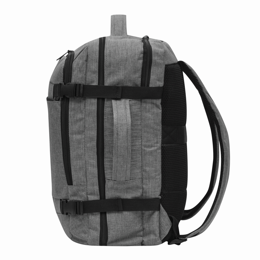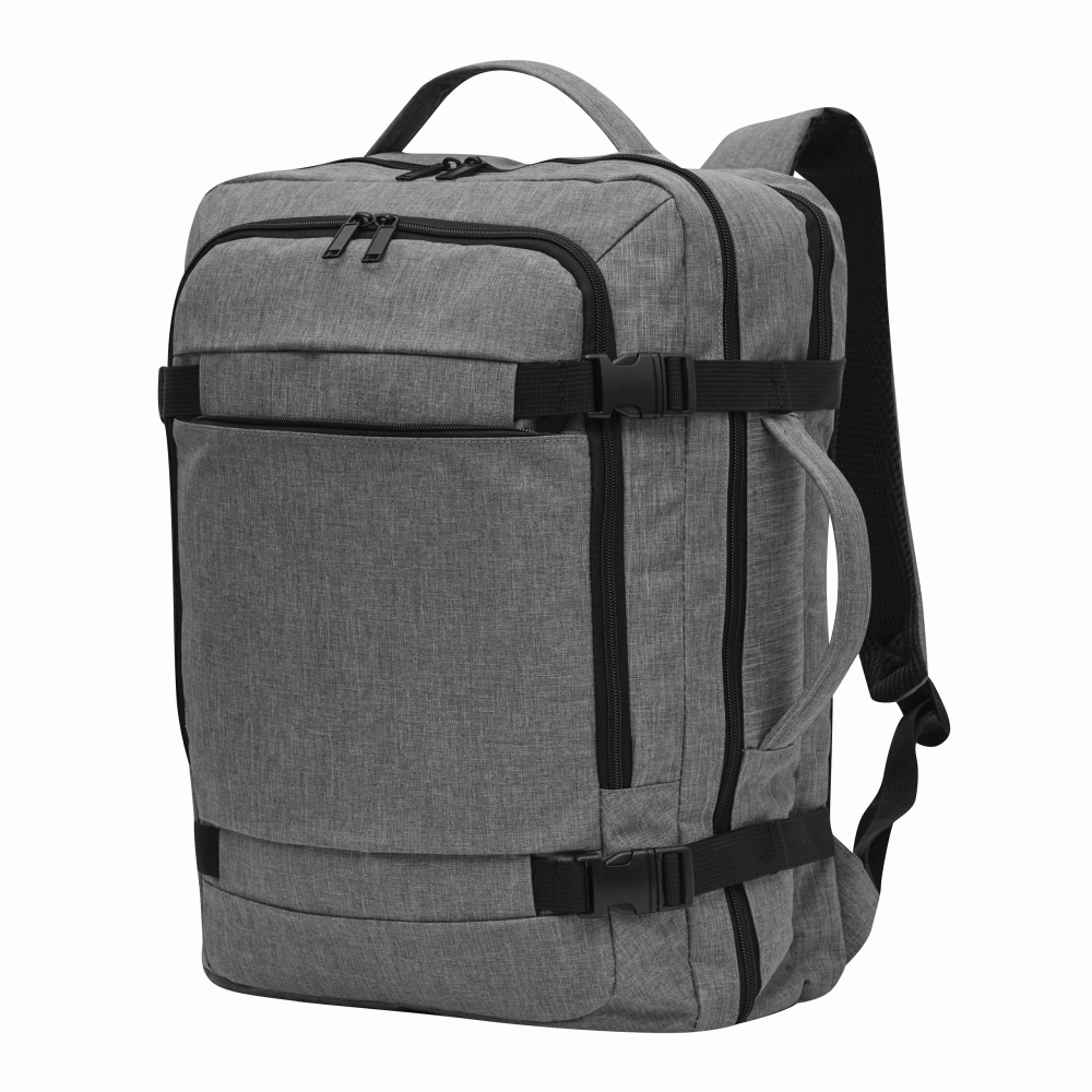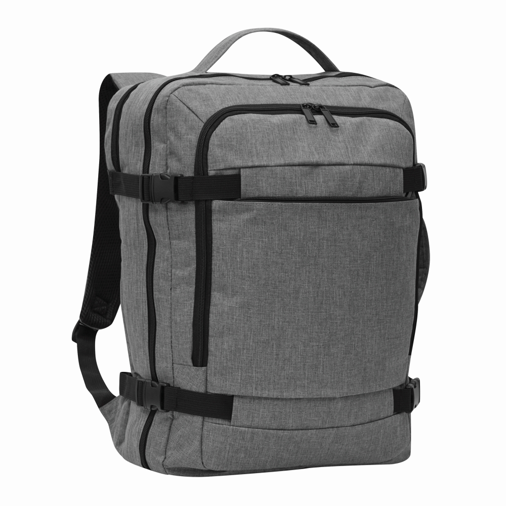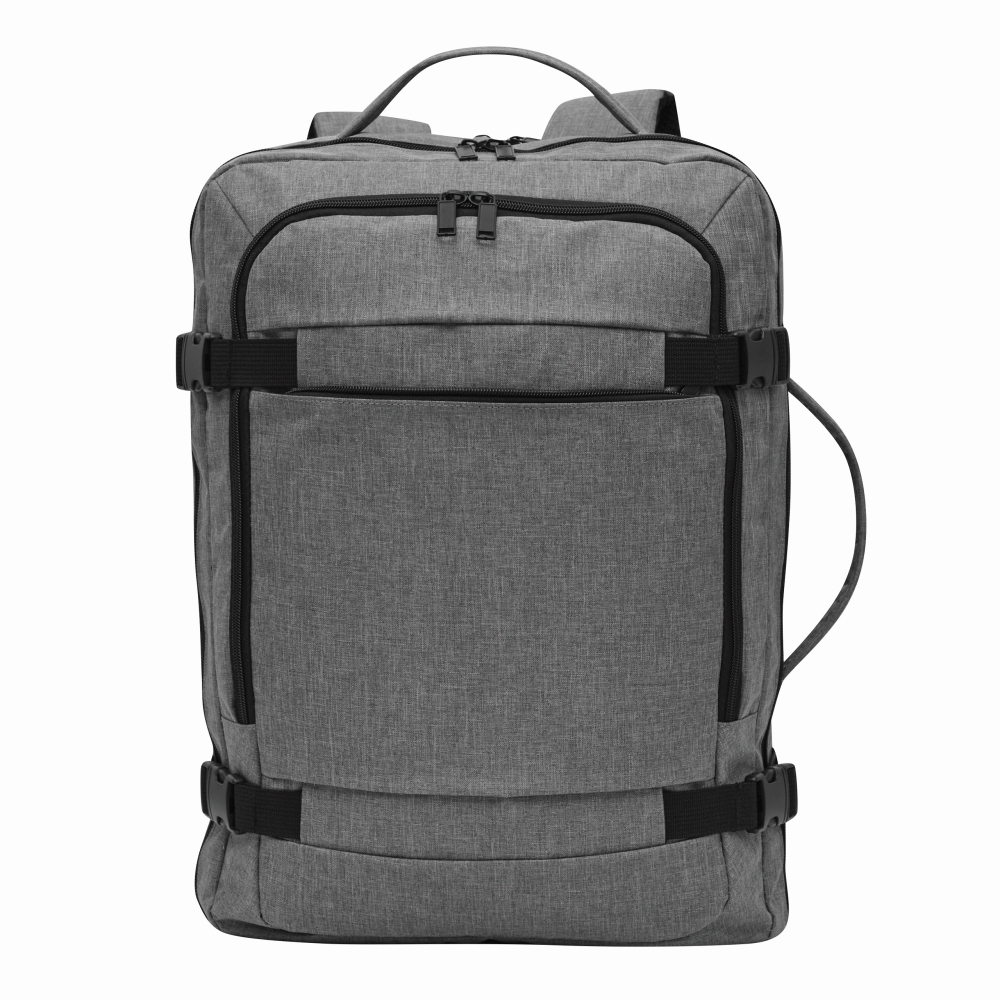2 front zippered compartments, one with organizer (3 slip pockets, 2 pen loops), 1 large padded main compartment with strap and zipper, 1 padded laptop compartment with zipper, 1 reinforced top and side grab handle, padded ergonomic shoulder straps and padded back panel with case for telescopic handle, 2 compression straps with snap fasteners on each side. Dimensions: approx. 32 x 20 x 45 cm