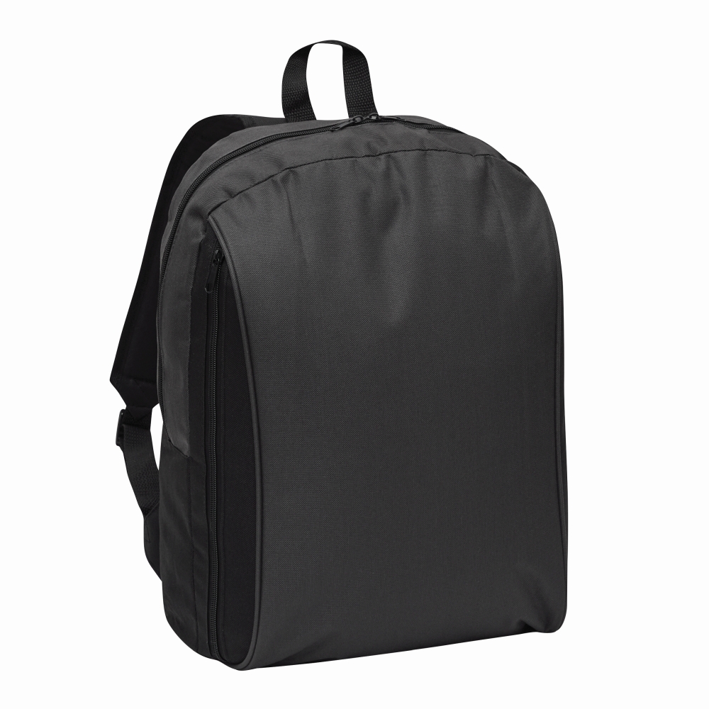 1 front pocket with vertical zip, 1 main compartment with zip, handle, adjustable padded shoulder straps and padded back panel. Dimensions: approx. 31 x 18.5 x 43 cm
