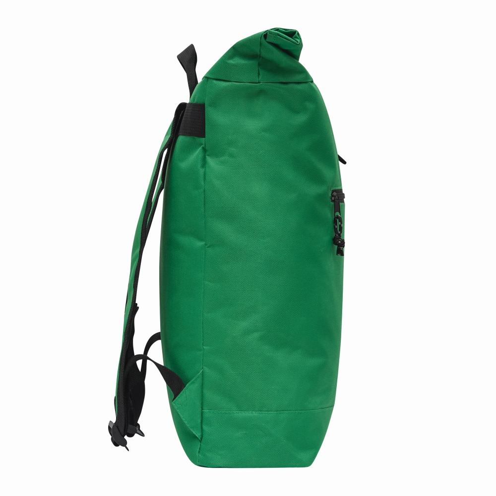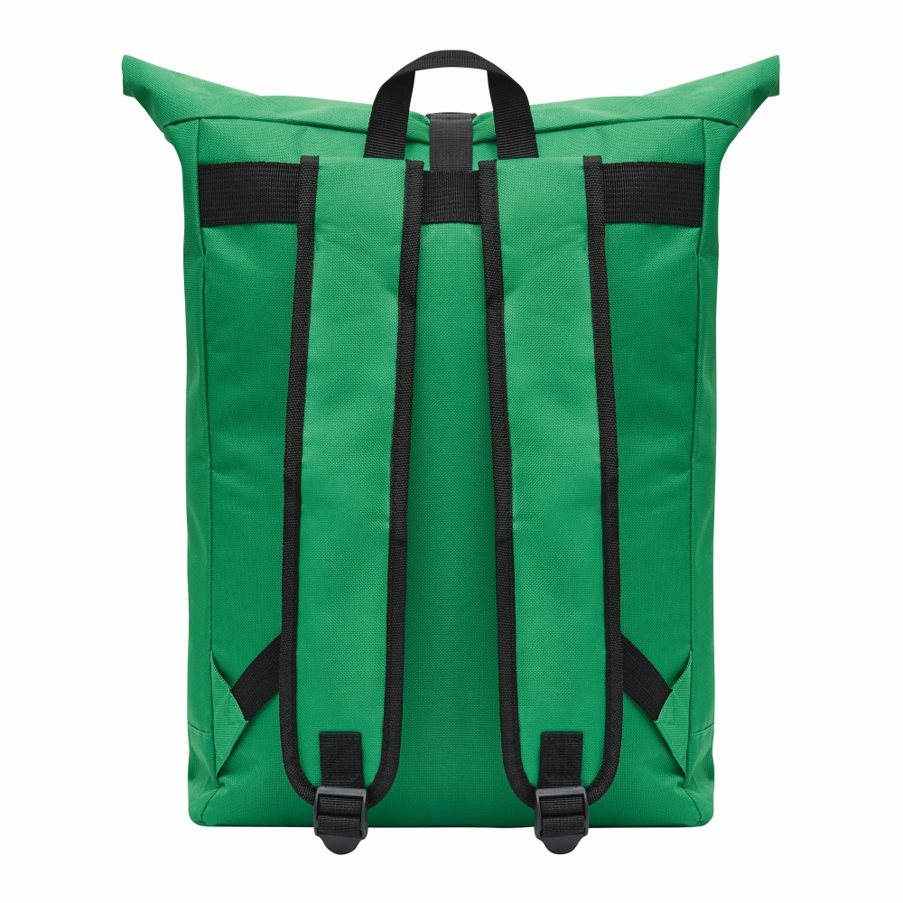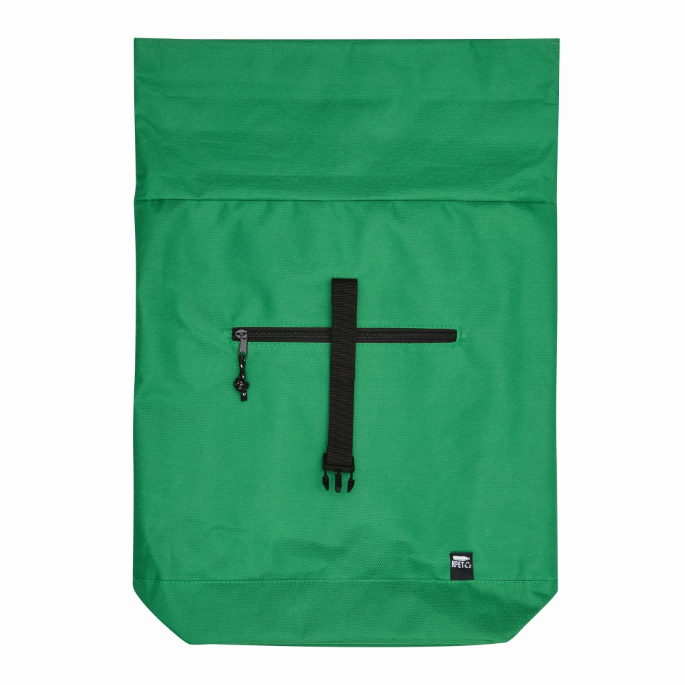 Backpack made of recycled plastic (RPET), front zippered compartment, large main compartment with a padded inner compartment for a laptop or tablet, the top can be rolled up and fastened with a snap, handle, padded bottom, shoulder straps, back panel. Dimensions: approx. 32 x 13 x 40-60 cm