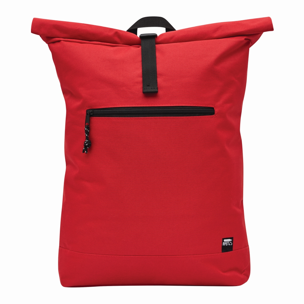 Backpack made of recycled plastic (RPET), front zippered compartment, large main compartment with a padded inner compartment for a laptop or tablet, the top can be rolled up and fastened with a snap, handle, padded bottom, shoulder straps, back panel. Dimensions: approx. 32 x 13 x 40-60 cm
