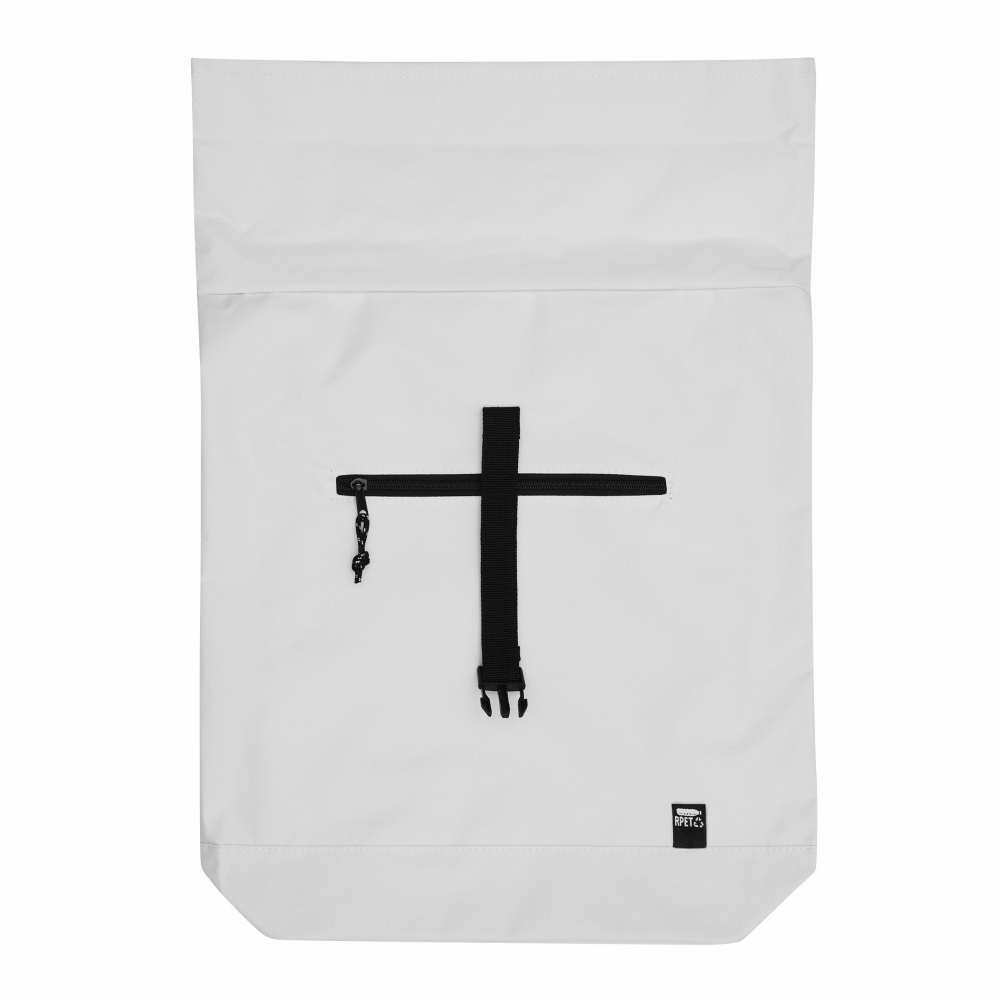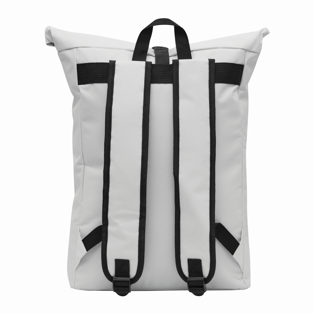 Backpack made of recycled plastic (RPET), front zippered compartment, large main compartment with a padded inner compartment for a laptop or tablet, the top can be rolled up and fastened with a snap, handle, padded bottom, shoulder straps, back panel. Dimensions: approx. 32 x 13 x 40-60 cm