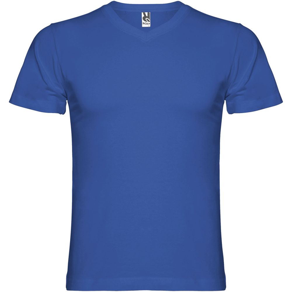 Tubular short-sleeve t-shirt with 2-layer v-neck. Reinforced covered seams in collar and shoulders. Removable label. The model is 190 cm and is wearing size L. Single Jersey knit of 100% Cotton, 155 g/m2.