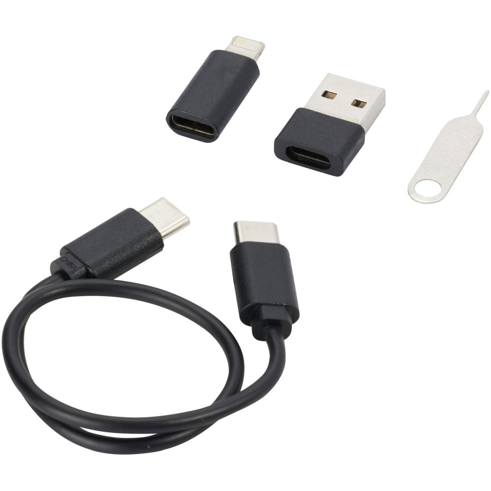 Modular data transfer and charging cable made from recycled plastic, delivered in an elegant storage box that also works as a phone stand. The cable offers multiple charging solutions: Type-C and USB-A input, and Type-C/iOS/micro USB output. Thanks to all of these adapters and connectors, this cable allows you to charge most smartphones, cameras, power banks, earbuds etc. The cable has a maximum output power of 2A. Features an eject pin that comes in handy anytime you need to take out your phone’s SIM card. The storage box also has room to store a micro SD memory card as well as a nano SIM card, making this the perfect travel accessory. Cable length: 26 cm. Supplied in a 100% recycled kraft paper envelope.