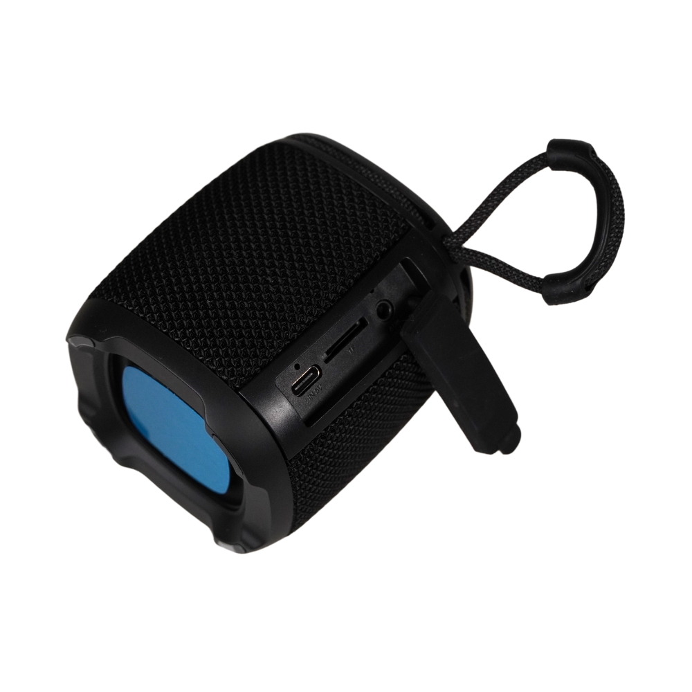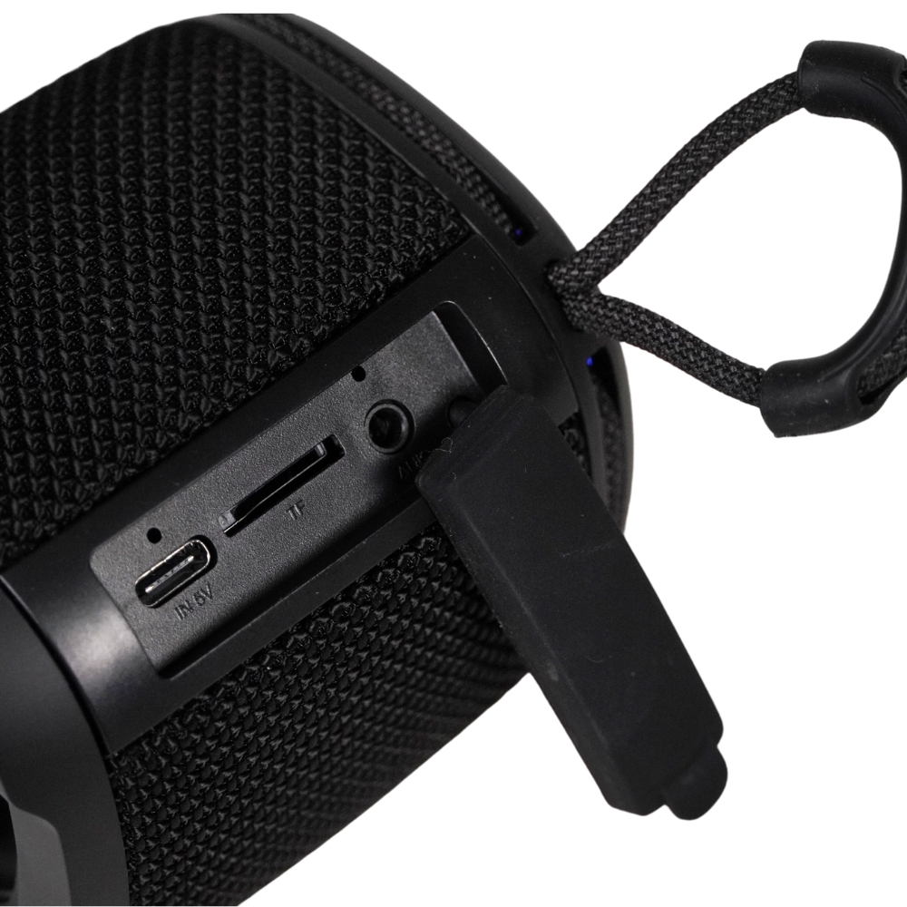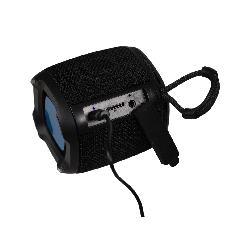 Schwarzwolf outdoor wireless slightly water resistant speaker is made in a black color with a wrist strap. It has an output of 5W, a range of 20 m, Bluetooth V5.1., a slot for a TF card and an USB-C connector. It contains an integrated rechargeable battery with a capacity of 500 mAh. Playing time on one charge is approx. 3–4 hours. Charging time to full charge is approx. 1–2 hours. The laser-engraved logo and border of the control panel is illuminated by changing colors of LED light. The speaker has a IPX5 water protection. The charging cable is included in the package. Packed in a gift box. Material: ABS, rubber, fabric, silicone. Dimensions: 7.2 × 8.2 × 7.2 cm.