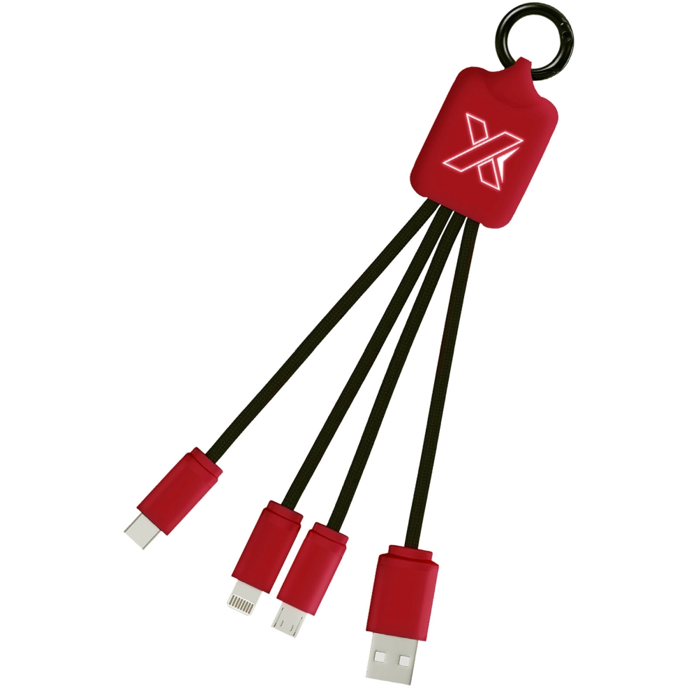 Light-up logo charging cable with rubber and metal finish fitted with three connectors (Type-C, Android, iPhone). Up to three devices can be charged simultaneously. Length of cables (including plugs): 10 cm. Recycled PET plastic cable and packaging is made of recycled paper and recycled plastic. Dimensions: 16 x 2,6 cm