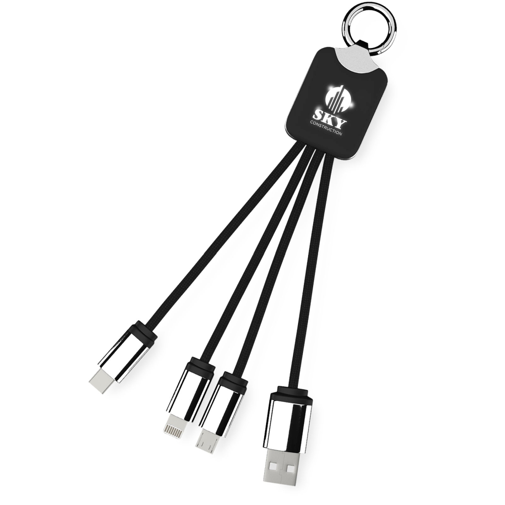 Light-up logo charging cable with rubber and metal finish fitted with three connectors (Type-C, Android, iPhone). Up to three devices can be charged simultaneously. Length of cables (including plugs): 10 cm. Recycled PET plastic cable and packaging is made of recycled paper and recycled plastic. Dimensions: 16 x 2,6 cm