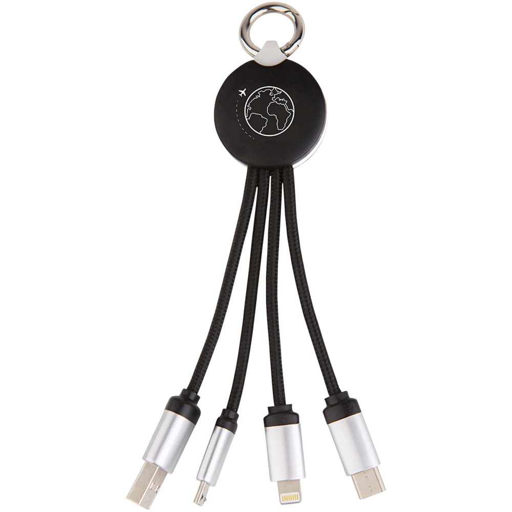 Light-up logo charging cable with rubber and metal finish fitted with three connectors (Type-C, Android, iPhone). Up to three devices can be charged simultaneously. Length of cables (including plugs): 10 cm. Recycled PET plastic cable and packaging is made of recycled paper and recycled plastic. Dimensions: 14 x 1,2 x 3,5 cm