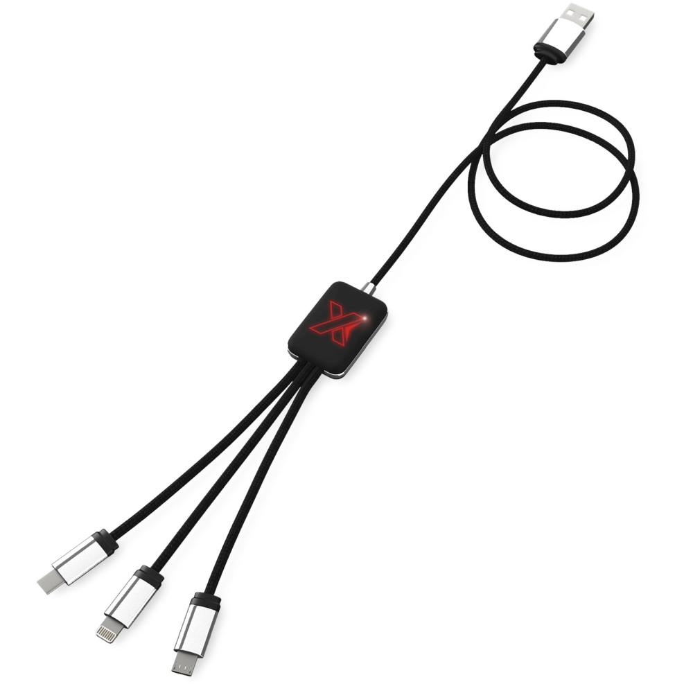 Light-up logo charging cable with rubber and metal finish fitted with three connectors (Type-C, Android, iPhone). Up to three devices can be charged simultaneously. Length of cables (including plugs): 10 cm. Total cable length: 1 metre. Recycled PET plastic cable and packaging is made of recycled paper and recycled plastic. Dimensions: 100 x 1,2 x 3 cm