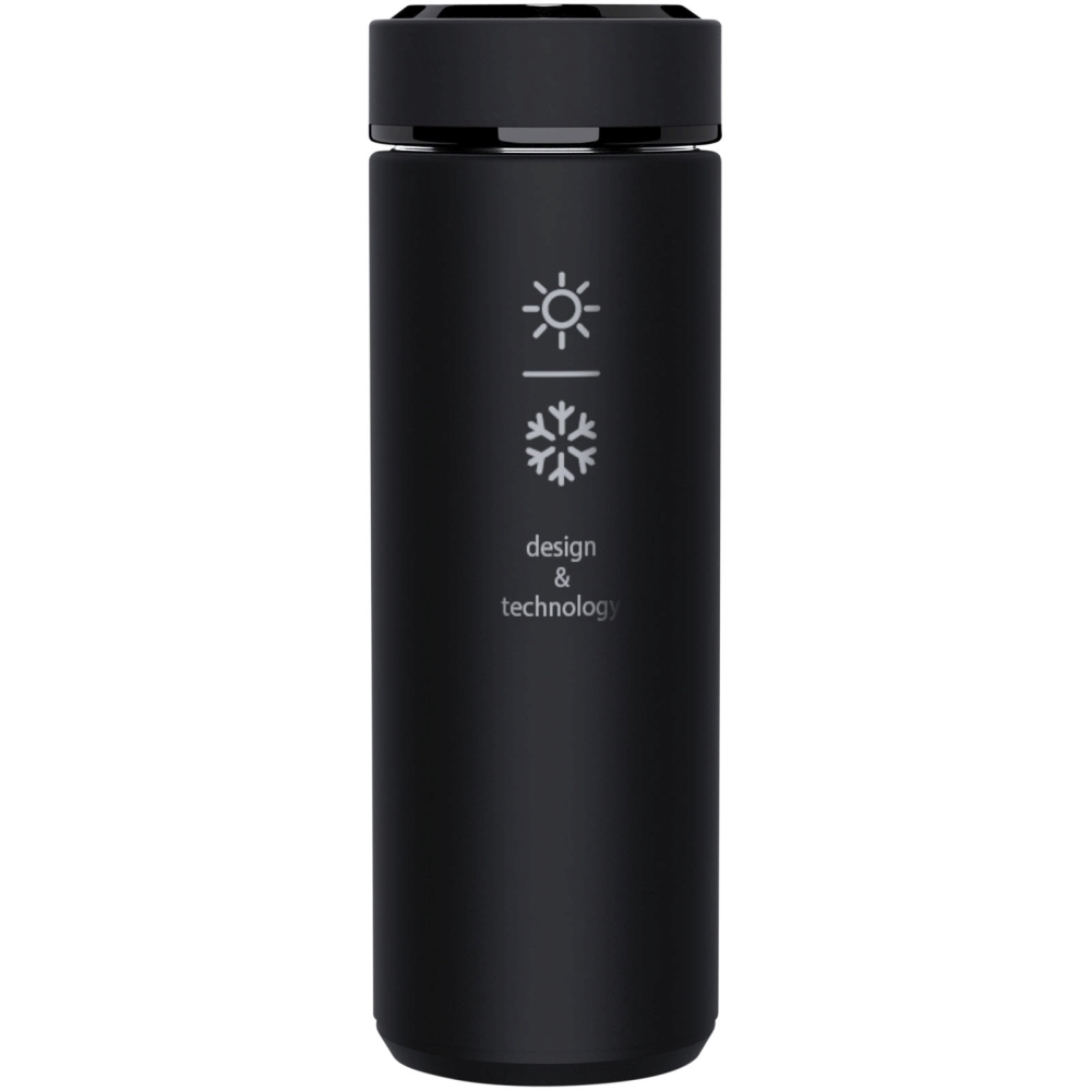 Double-walled 450 ml insulated stainless steel bottle with a temperature sensor. Thanks to the "Touch & Light" system, the temperature of the drink is displayed on the bottle cap (in Celsius). Suitable for both hot and cold drinks. Delivered in a cylindrical gift box made of recycled paper. Size: O 47 x 225 mm. Battery included: CR 2450 (3V). Battery cannot be replaced. Can display temperature 20.000 times. Dimensions: 23 x O 6,3 cm