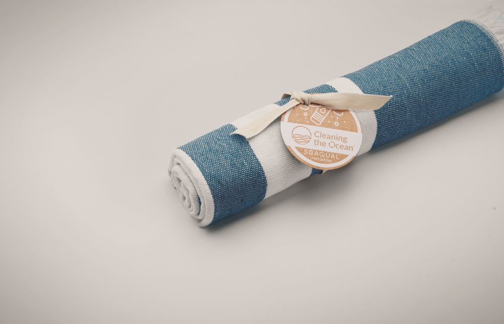 Recycled fabrics hammam towel. 70% recycled cotton and 30% recycled polyester SEAQUAL®. 300 gr/m². 100x170 cm. SEAQUAL® INITIATIVE works with ocean clean-ups around the world to bring value to the waste that they recover. Made in EU.