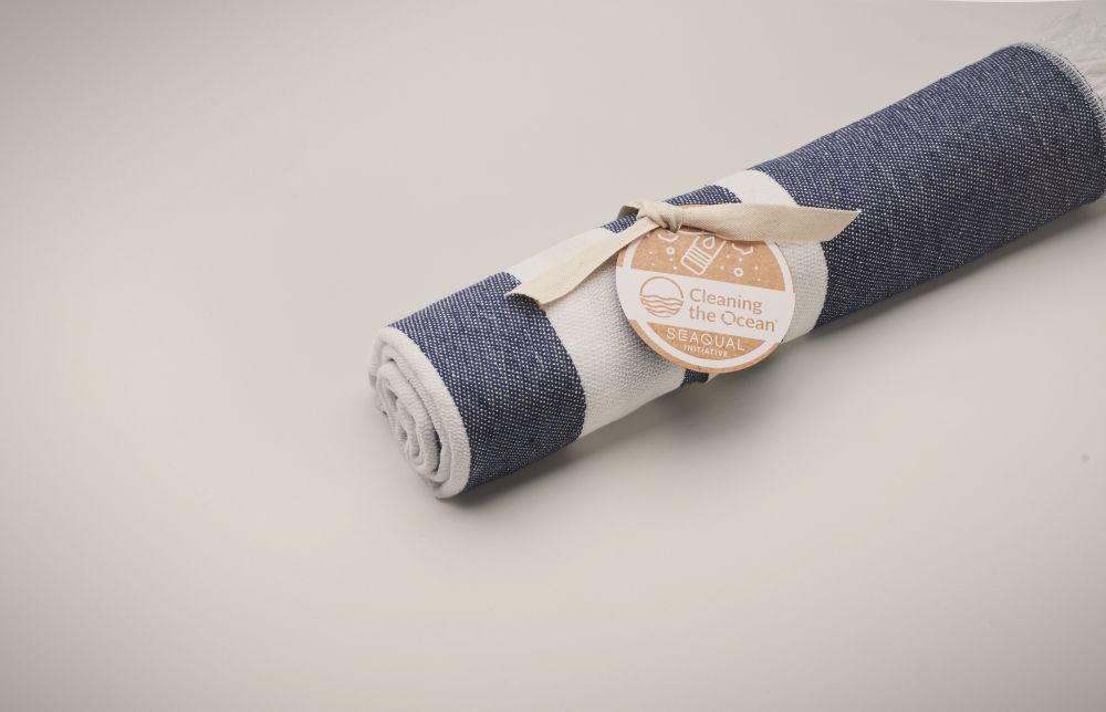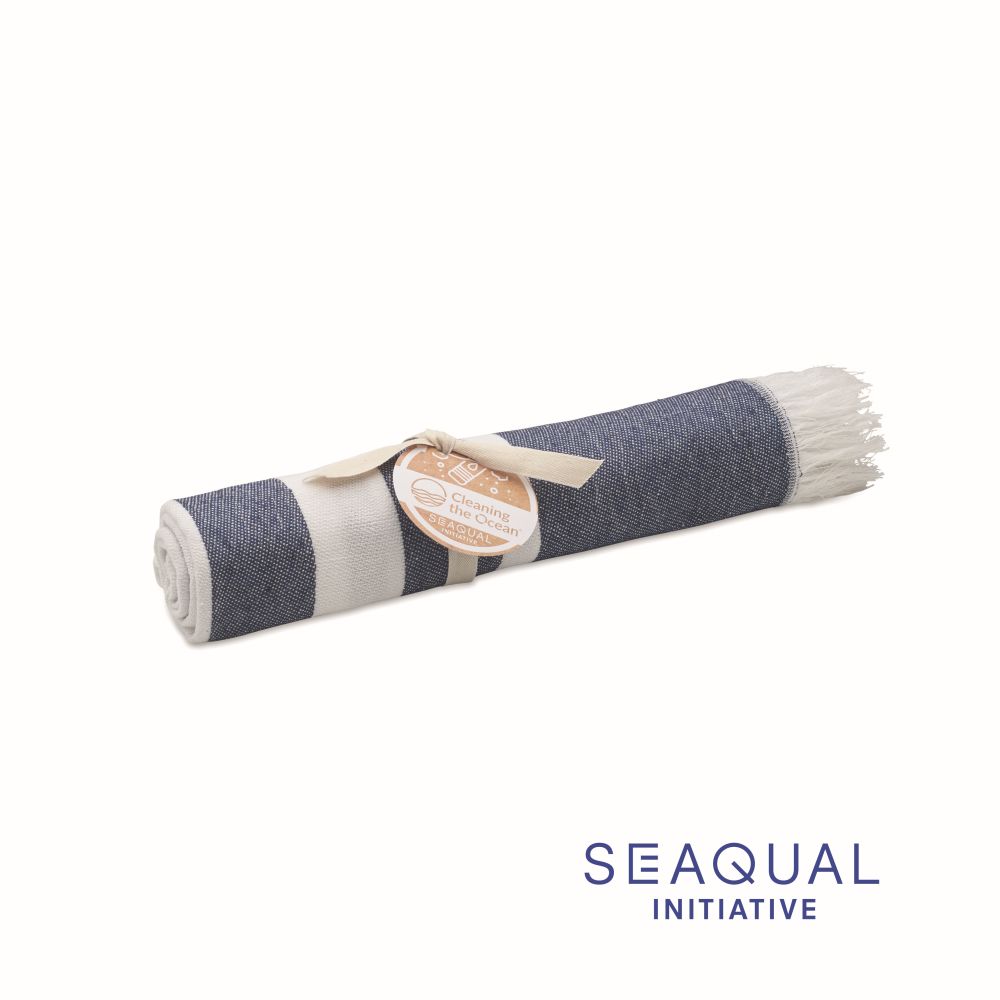 Recycled fabrics hammam towel. 70% recycled cotton and 30% recycled polyester SEAQUAL®. 300 gr/m². 70x140 cm. SEAQUAL® INITIATIVE works with ocean clean-ups around the world to bring value to the waste that they recover. Made in EU.