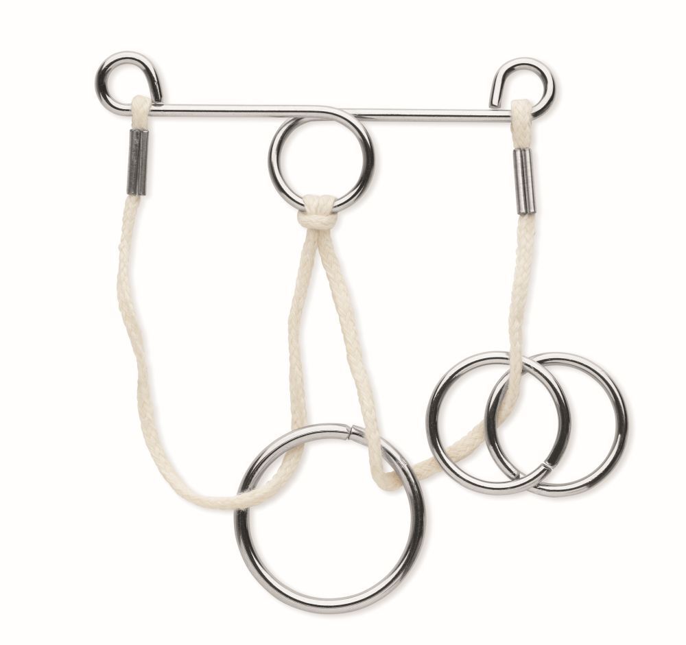 Set of 2 metal, wood and cotton cord brain teasers: 2 and 4 pieces respectively. Presented in a recycled paper box.