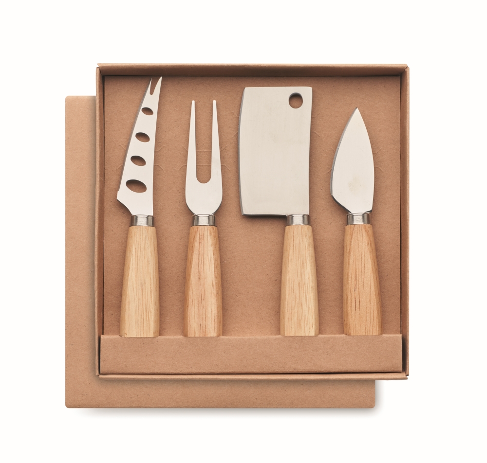 Set of 3 serving cheese knives and 1 fork in stainless steel and with rubber wood handle. Dimensions: 17 x 17 x 2 cm