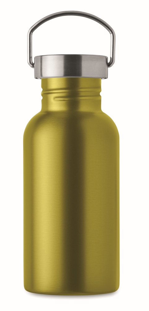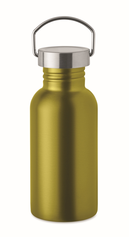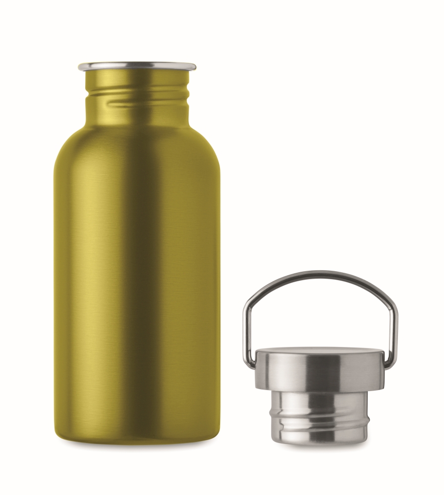 Single wall bottle in recycled stainless steel (90 % recycled stainless steel and 10% stainless steel) with lid and handle. Leak-free. Capacity: 500 ml. Dimensions: O 7 x 18 cm