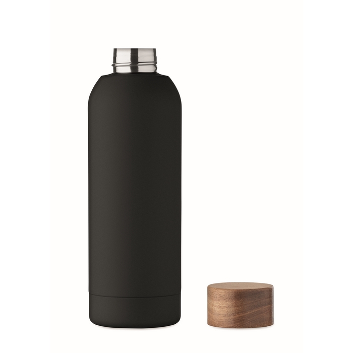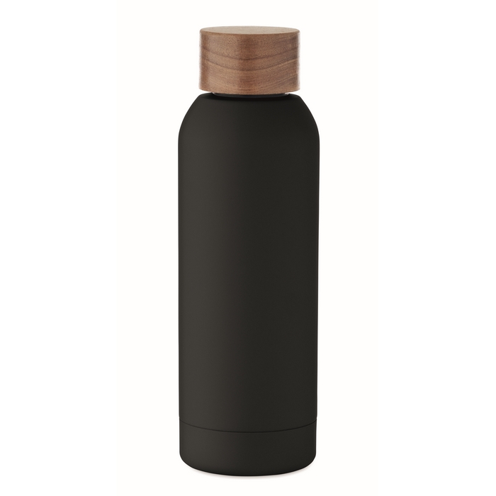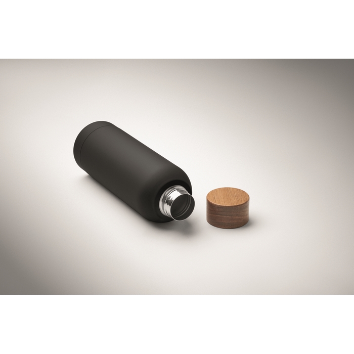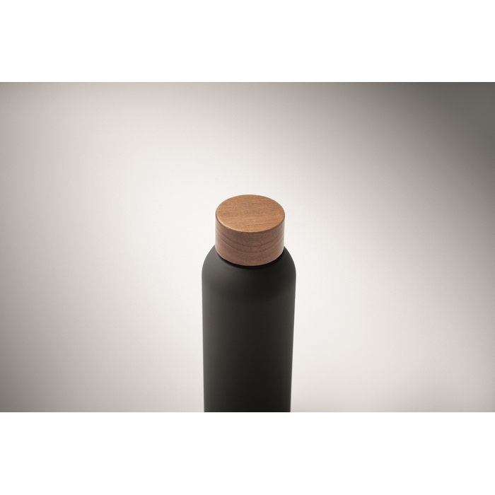 Single wall bottle recycled stainless steel (90% recycled stainless steel and 10% stainless steel) with rubber finish and acacia wooden lid finish. Leak-free. Capacity: 700 ml. As this is a single walled bottle heat transfer can still occur.Dimensions: 7 x 22,5cm