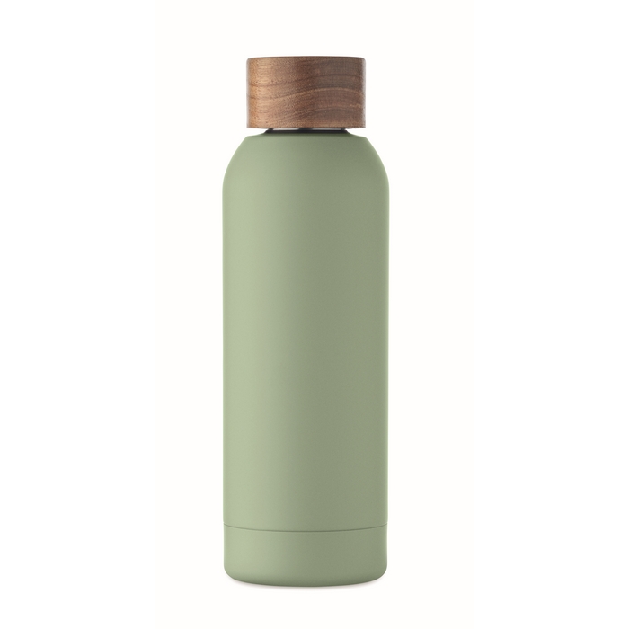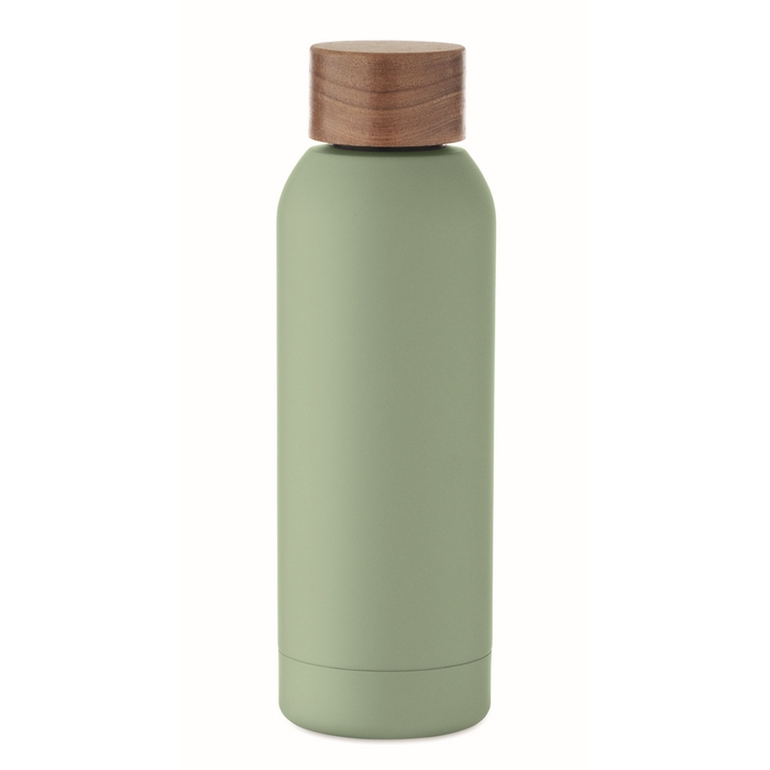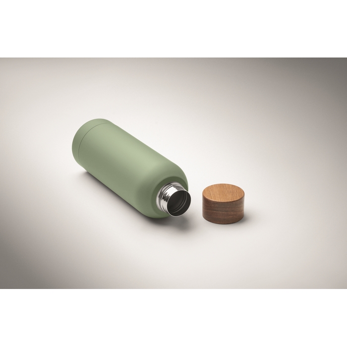 Single wall bottle recycled stainless steel (90% recycled stainless steel and 10% stainless steel) with rubber finish and acacia wooden lid finish. Leak-free. Capacity: 700 ml. As this is a single walled bottle heat transfer can still occur.Dimensions: 7 x 22,5cm