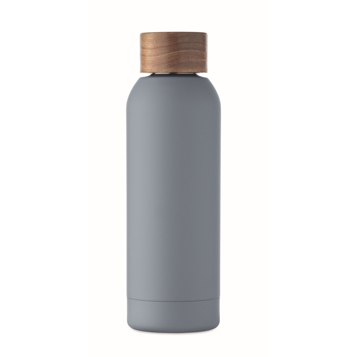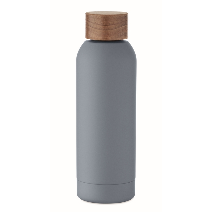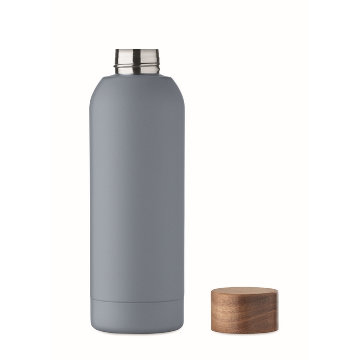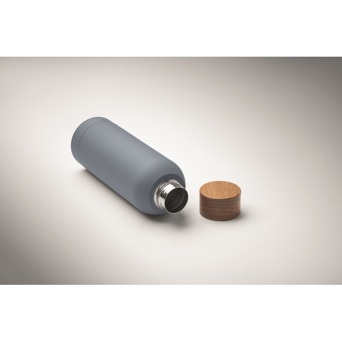 Single wall bottle recycled stainless steel (90% recycled stainless steel and 10% stainless steel) with rubber finish and acacia wooden lid finish. Leak-free. Capacity: 700 ml. As this is a single walled bottle heat transfer can still occur.Dimensions: 7 x 22,5cm