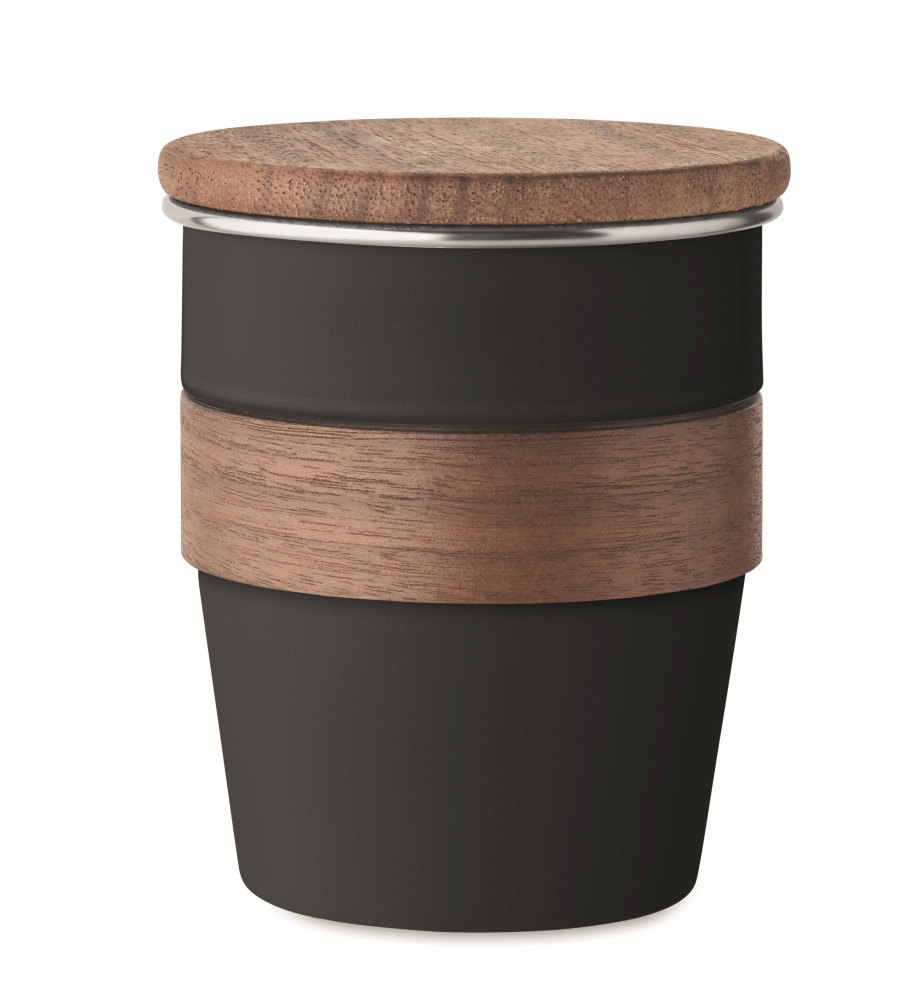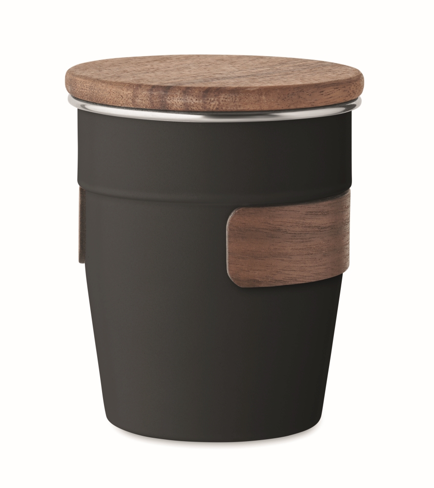 Single wall tumbler in recycled stainless steel (90% recycled stainless steel and 10% stainless steel) with walnut grip and lid. Capacity: 350 ml. Remove grip for cleaning. As this is a single walled mug heat transfer can still occur. Dimensions: O 8,5 x 10,5 cm