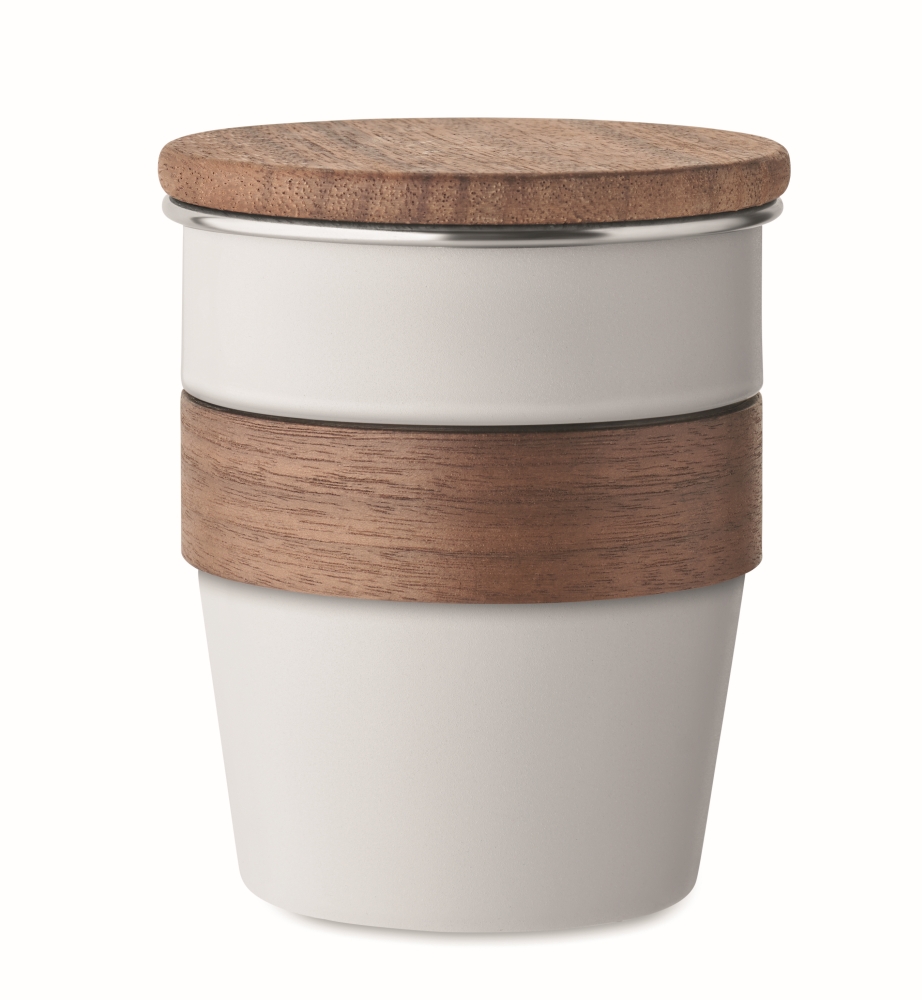 Single wall tumbler in recycled stainless steel (90% recycled stainless steel and 10% stainless steel) with walnut grip and lid. Capacity: 350 ml. Remove grip for cleaning. As this is a single walled mug heat transfer can still occur. Dimensions: O 8,5 x 10,5 cm