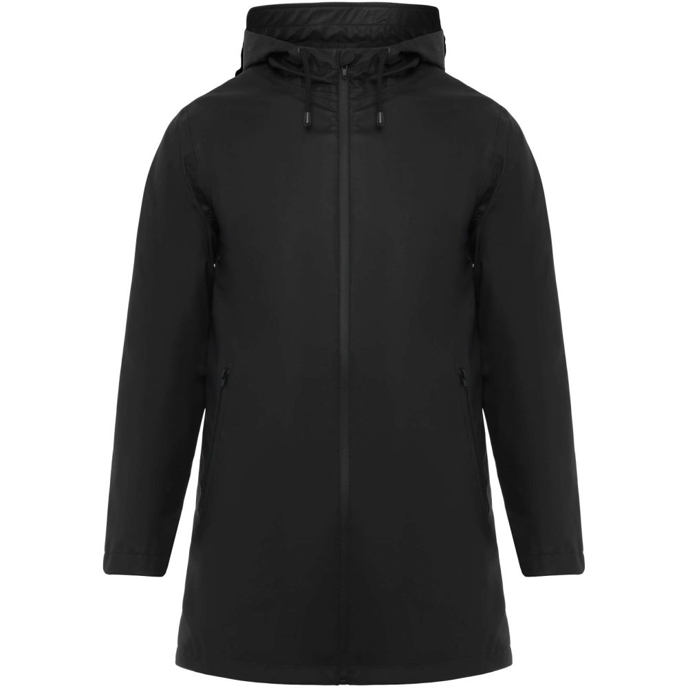 Waterproof raincoat. Hood with peak. Heat-sealed zips and seams. Contrasting details in black. Two side pockets with zip. Slit on back hem. Removable label. Waterproof. The model is 185 cm and is wearing size M.