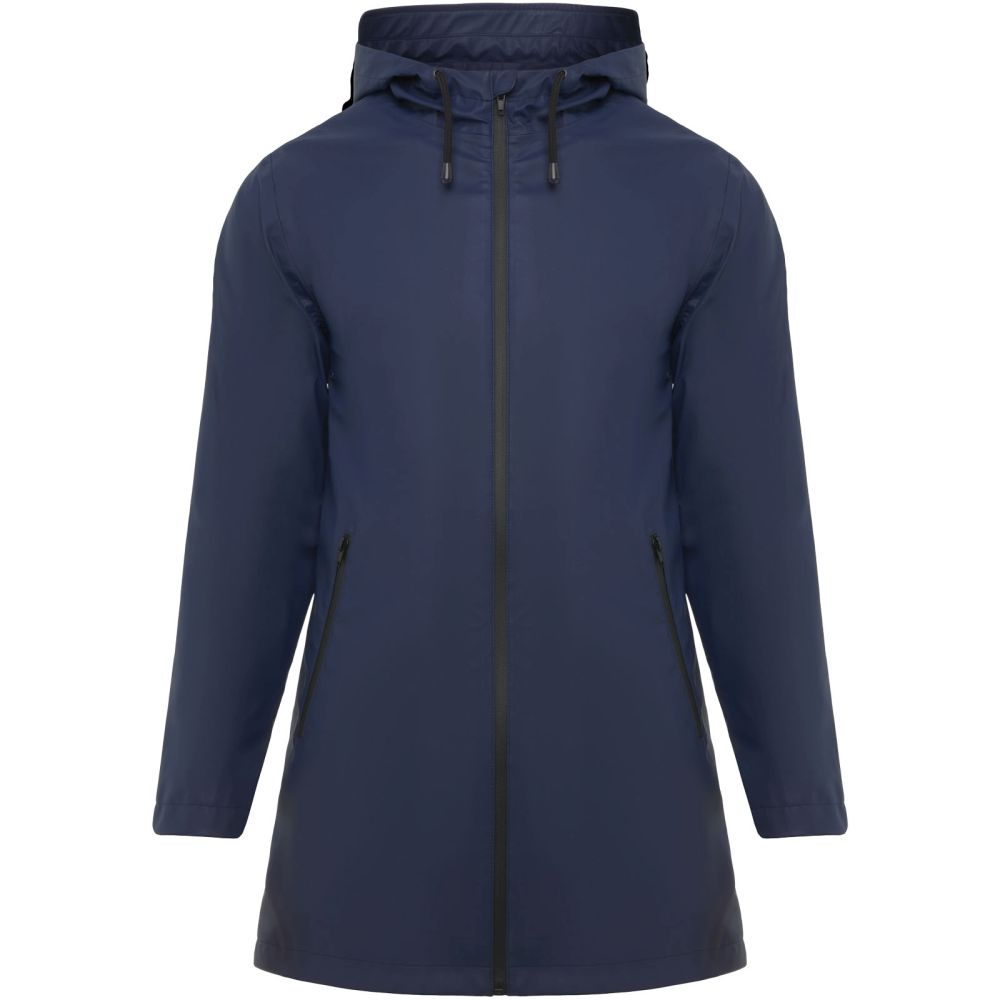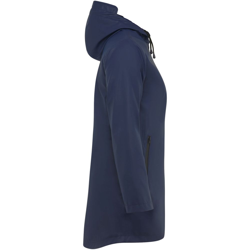 Waterproof raincoat for women. Hood with peak. Heat-sealed zips and seams. Contrasting details in black. Two side pockets with zip. Slit on back hem. Removable label. Waterproof. The model is 179 cm and is wearing size S.