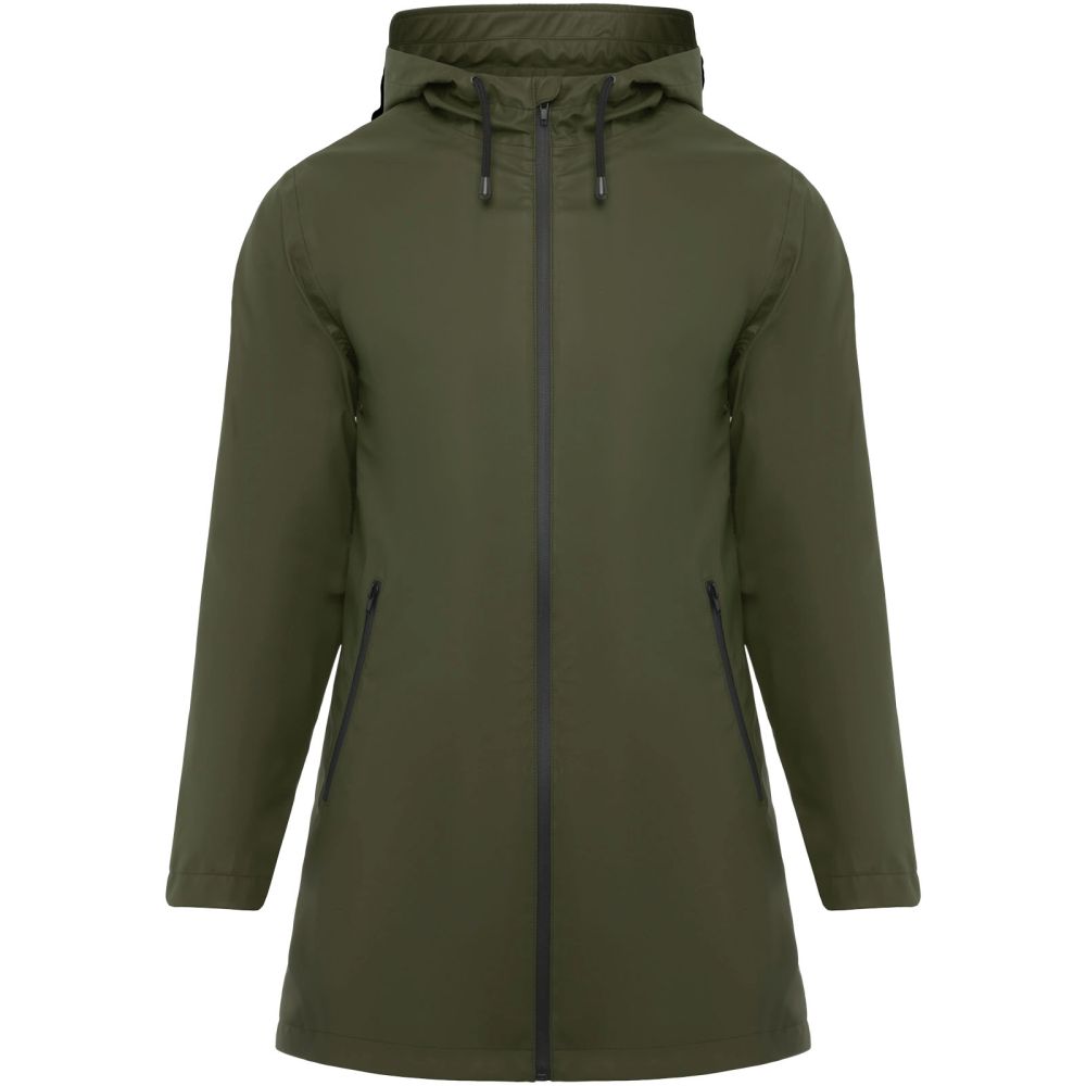 Waterproof raincoat for women. Hood with peak. Heat-sealed zips and seams. Contrasting details in black. Two side pockets with zip. Slit on back hem. Removable label. Waterproof. The model is 179 cm and is wearing size S.