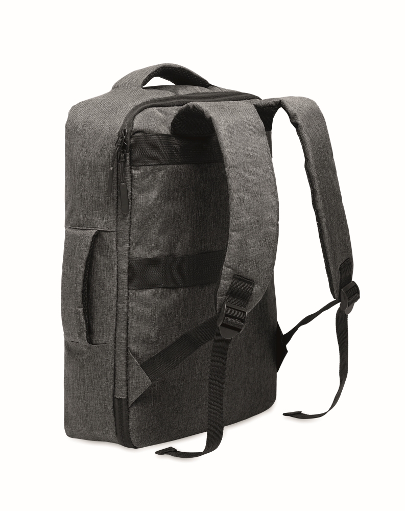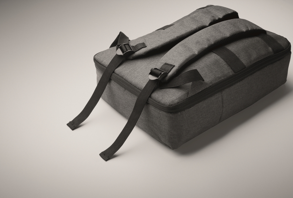 Slim 15 inch laptop backpack in 300D RPET with safe 180 degree opening with 210D RPET lining. Includes laptop compartment, 2 internal slip pockets, 2 internal pen pockets and 2 padded carry handles. Soft padded back and shoulder straps. Suitcase sleeve. Dimensions: 41 x 29 x 11cm