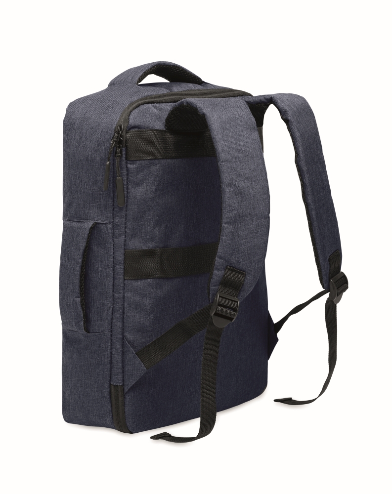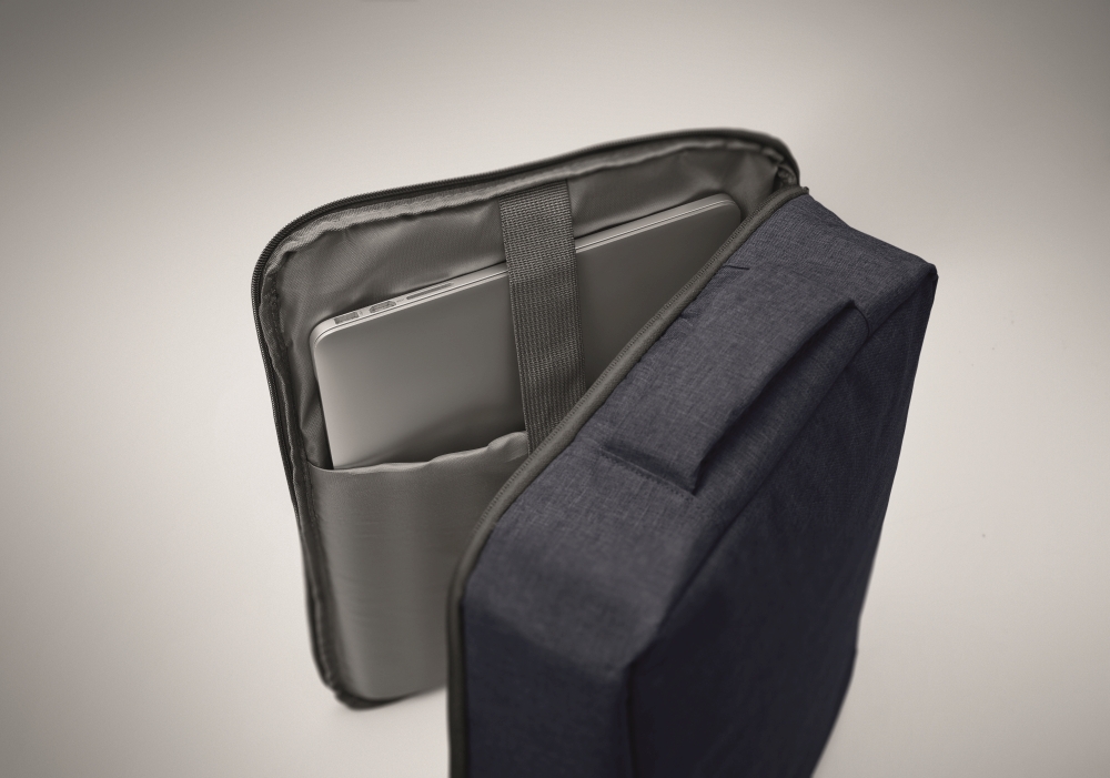 Slim 15 inch laptop backpack in 300D RPET with safe 180 degree opening with 210D RPET lining. Includes laptop compartment, 2 internal slip pockets, 2 internal pen pockets and 2 padded carry handles. Soft padded back and shoulder straps. Suitcase sleeve. Dimensions: 41 x 29 x 11cm