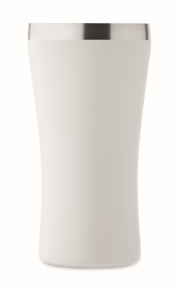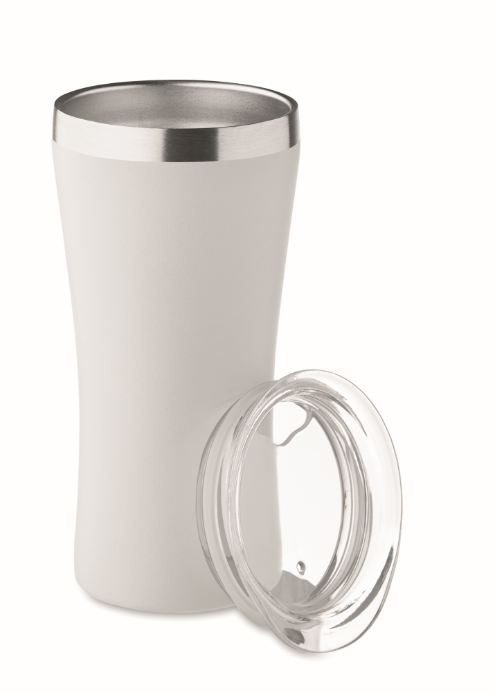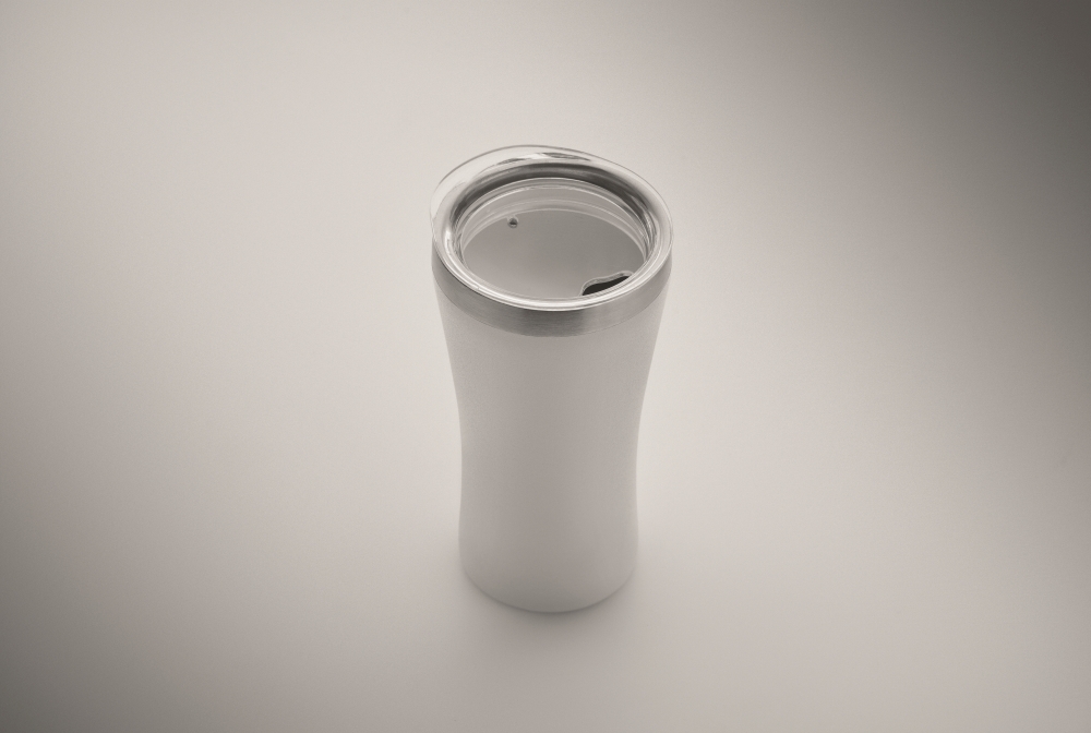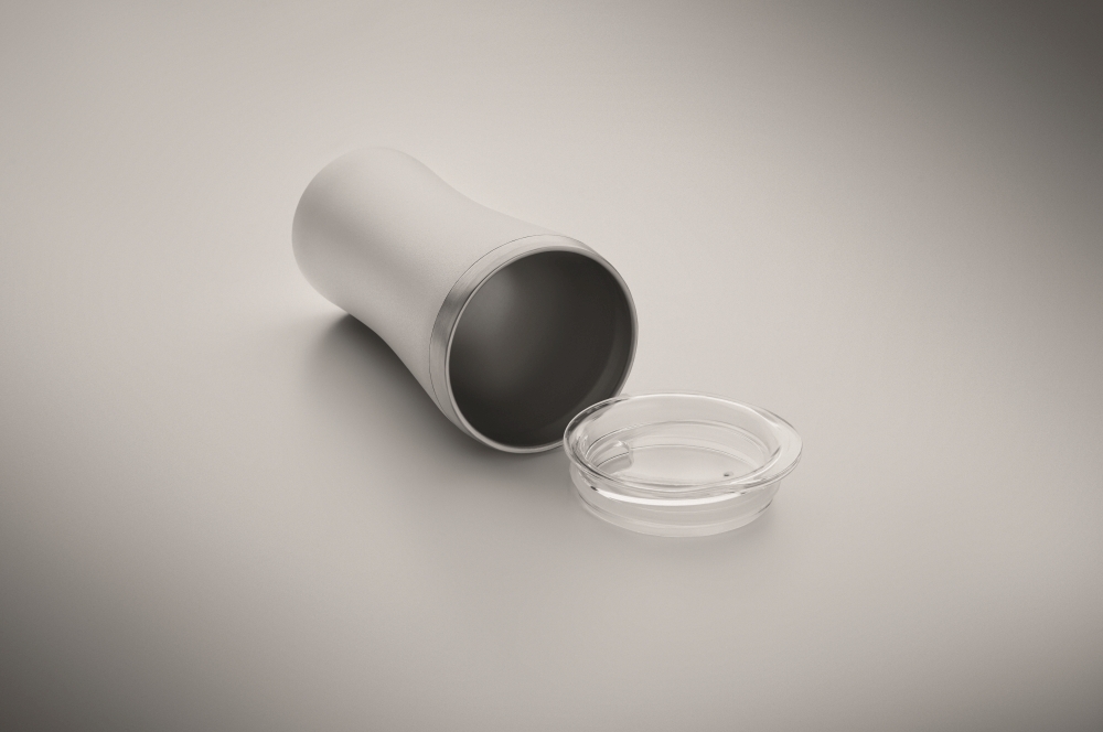 Small double wall vacuum insulated tumbler in recycled stainless steel (90% recycled stainless steel and 10% stainless steel) with drinking hole in the lid in transparent PP. Capacity: 160 ml. Dimensions: O 6 x 11.5 cm