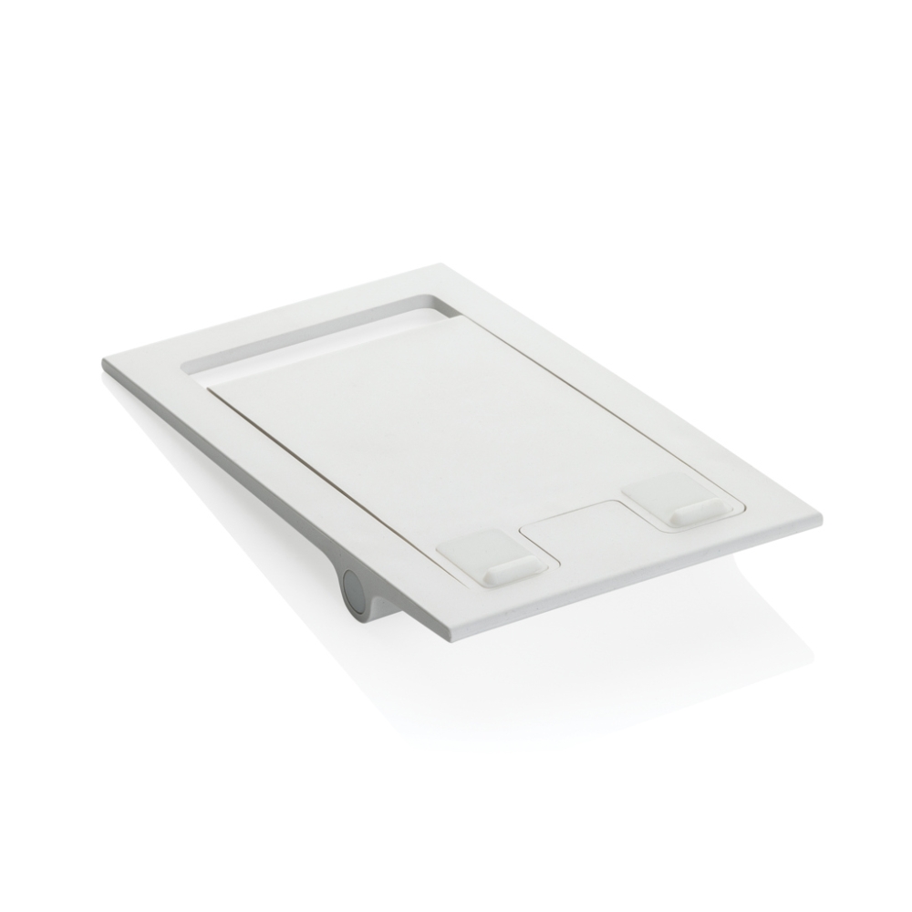 Flat and foldable phone stand made from RCS recycled ABS. The stand comes flat and folded and can be unfolded into a phone stand that can carry all size phones. The stand is strong enough to adjust the viewing angle. With silicon cushioning to keep your