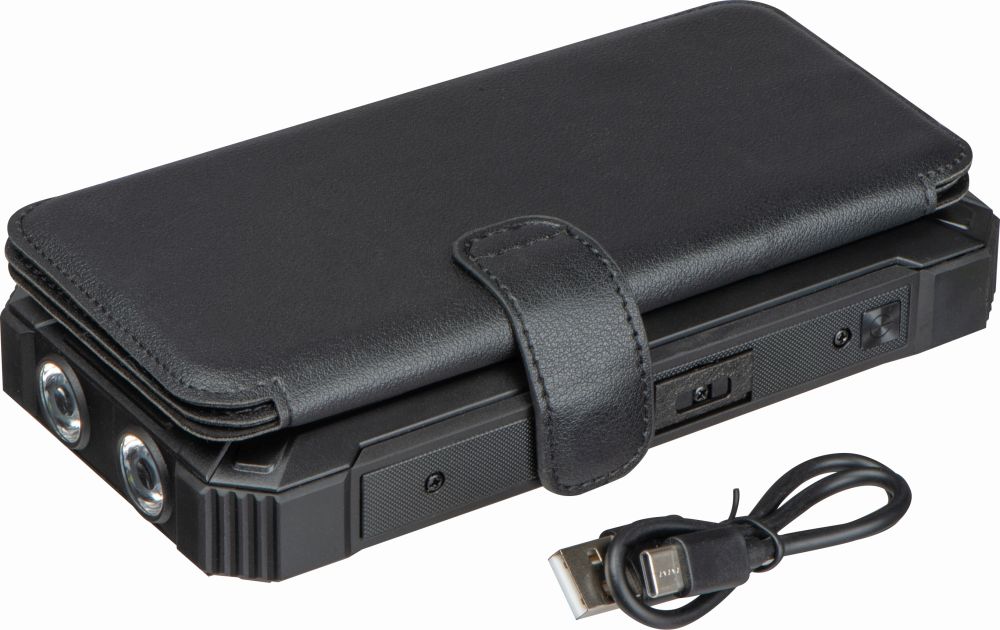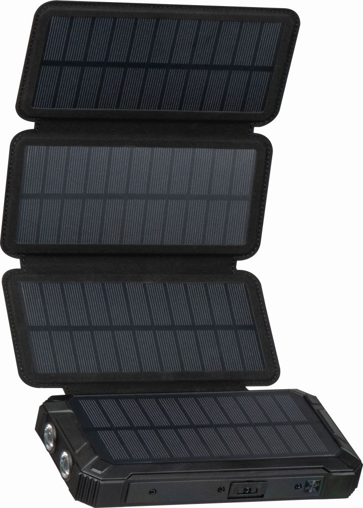 Solar power bank with 20,000 mAH / 5 V / 5 Watt output and four fold-out solar panels for optimum energy supply. Includes C-type USB, micro USB and IOS charging cables and wireless charging function. We print your logo on the front.