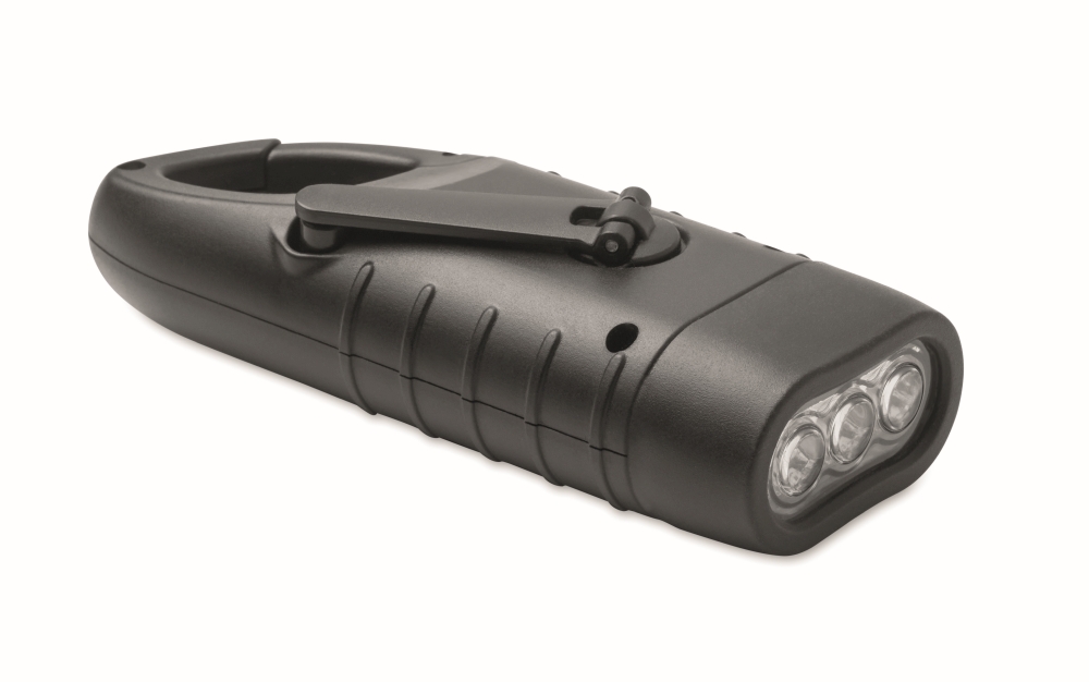 3 white LED torch powered both solar panel and dynamo crank in recycled ABS. Dimensions: 12,4 x 4,5 x 3,2 cm