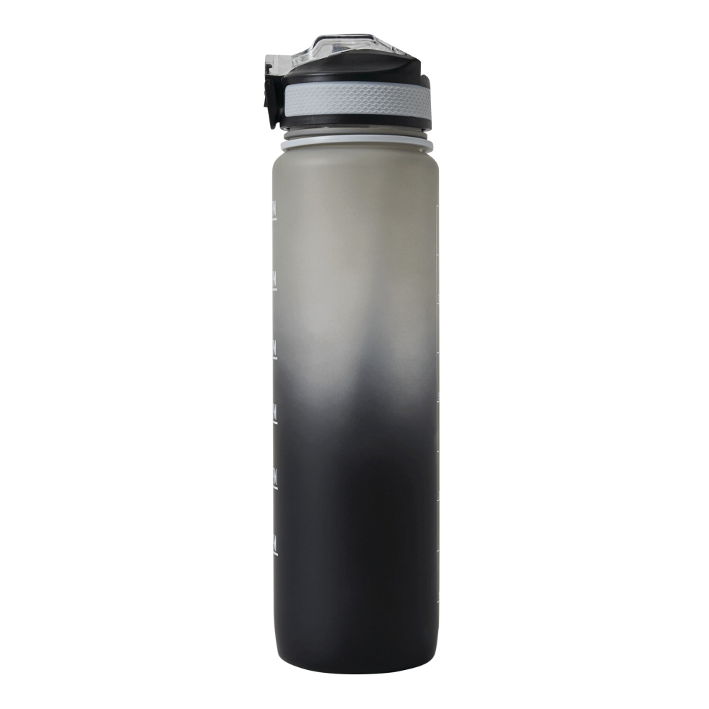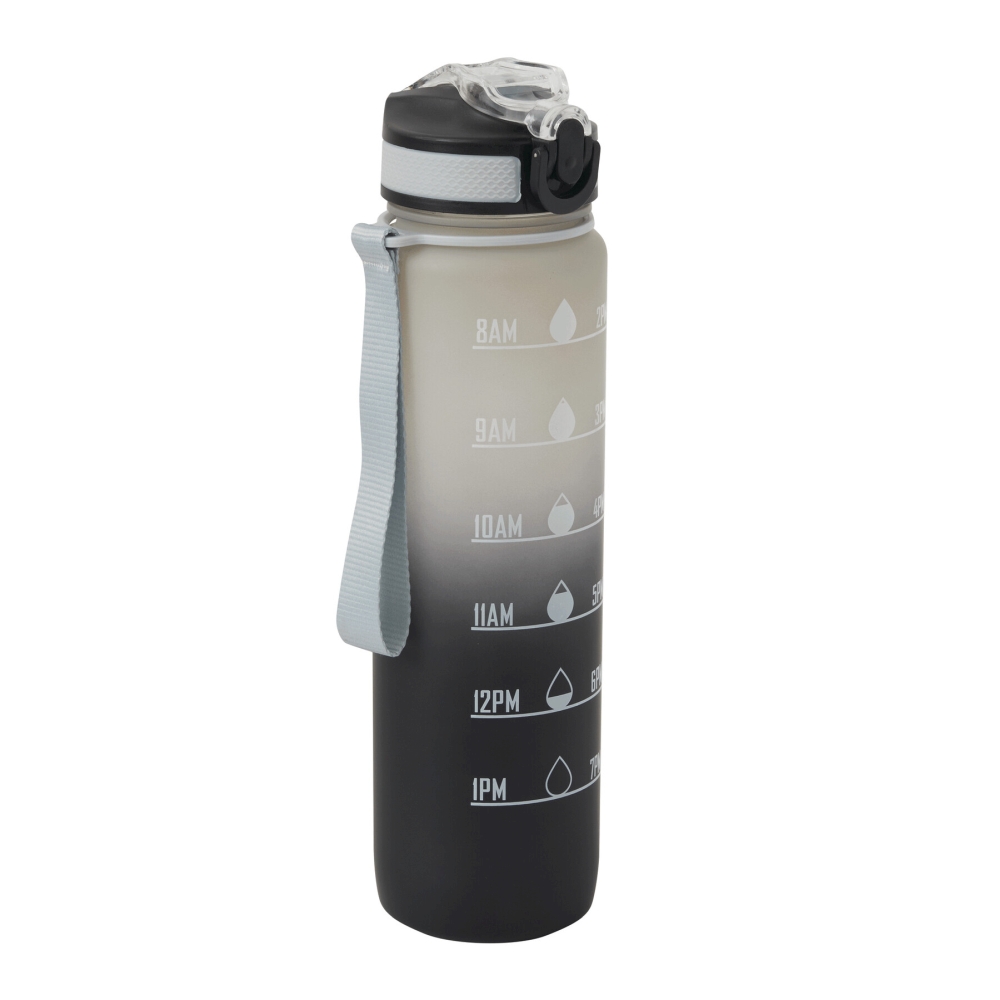 Sports water bottle: frosted, coloured bottle made of durable PETG, colour-matching plastic screw cap with silicone sealing ring, push of a button flips up the drinking spout and its cover (one-handed operation), with safety lock, integrated, removable straw with soft silicone mouthpiece, motivational time and water volume scale (time of day / ml), with hand strap, capacity approx. 1.000 ml, in a box. Dimensions: O7 x 29 cm