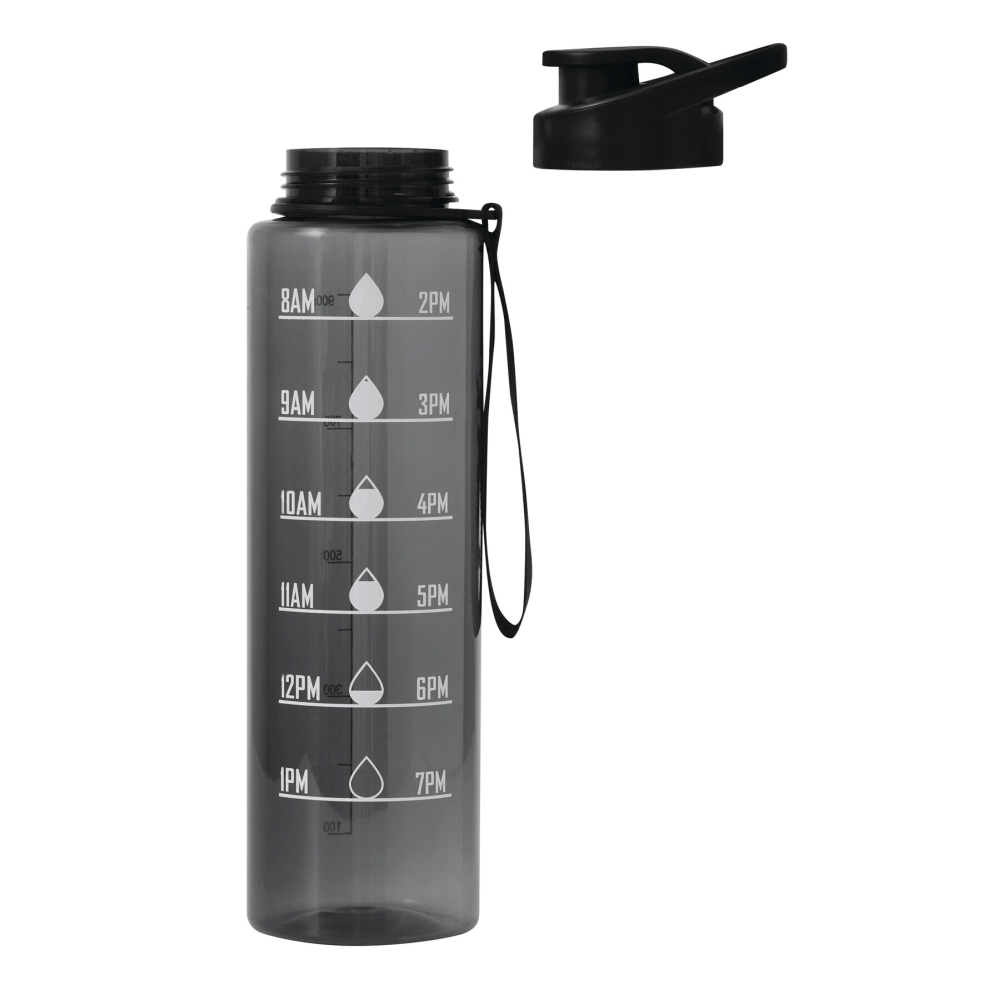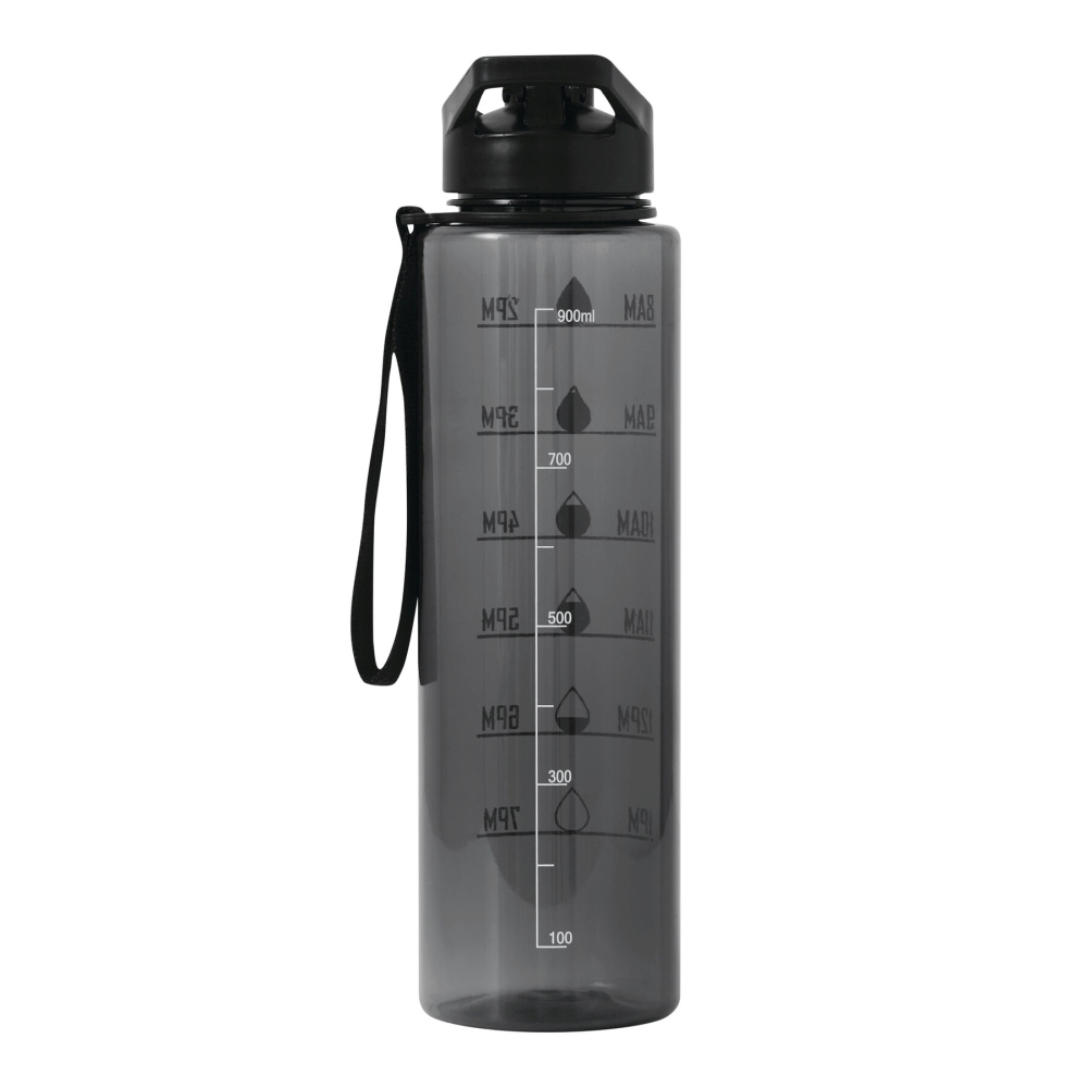Sports water bottle: transparent, coloured bottle made of durable PETG, colour-matching plastic screw cap with silicone sealing ring, flip-up drinking spout and carry handle, motivational time and water volume scale (time of day / ml), with hand strap, capacity approx. 1.000 ml. Dimensions: O7,5 x 27,4 cm
