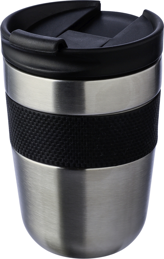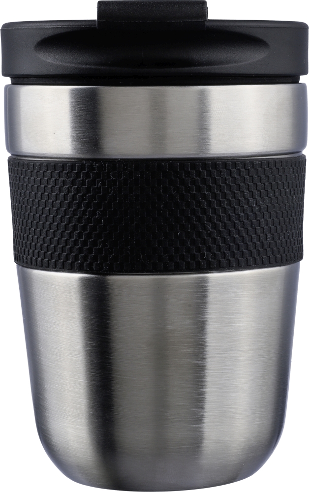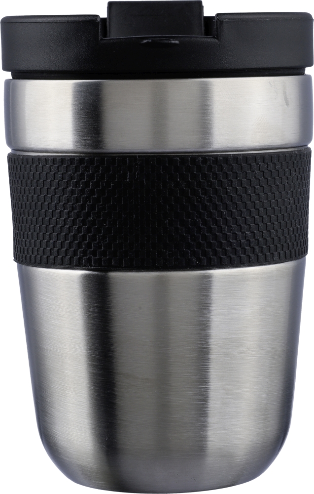 Stainless steel double-walled drinking mug (300 ml) with a PP lid and silicone grip. Keeps contents hot for 4 hours and cold for 6 hours. The interior is made of stainless steel 304, and the exterior is stainless steel 201. Individually packaged in a brown cardboard box. Dimensions: 8,5 x 8,5 x 13 cm
