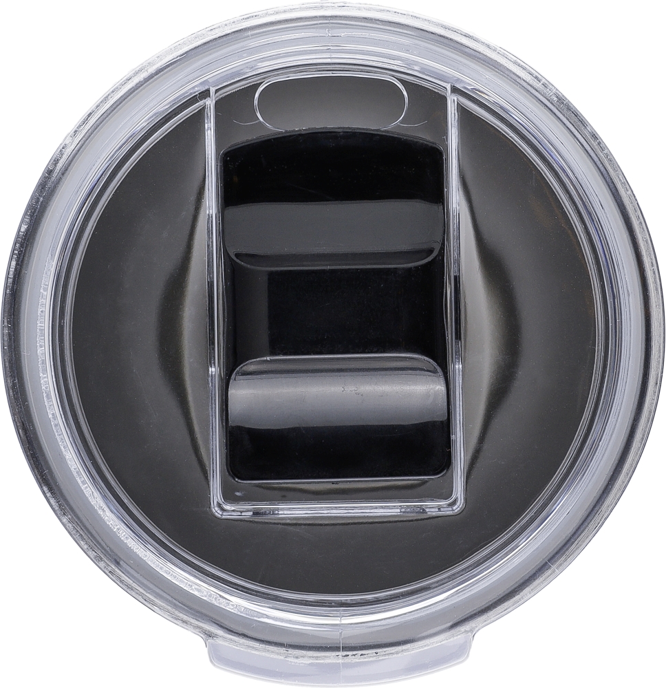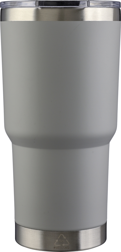 Stainless steel double-walled mug (590 ml) with PS lid. Recycled logo engraved on the mug. The interior is made of stainless steel 304, and the exterior is stainless steel 201. Individually packaged in a brown cardboard box. Dimensions: 9 x 18 cm