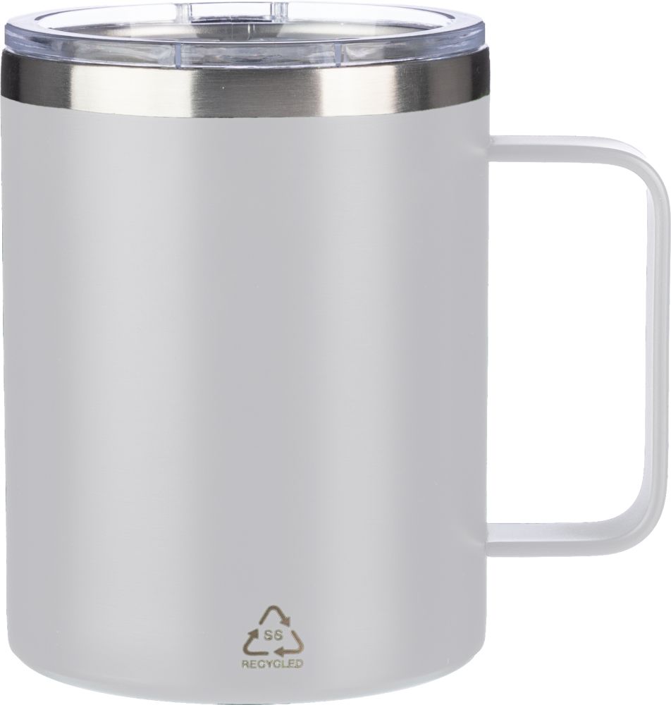 Stainless steel double-walled (S/S304) drinking mug (300 ml) with matte finish. PS lid on the topside with closure. Includes recycled stainless steel logo on the front side of the mug. Individually packaged in a brown carton box.