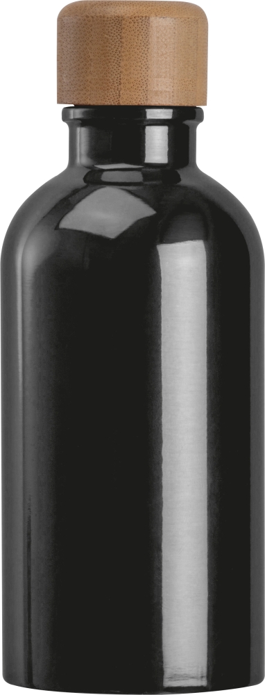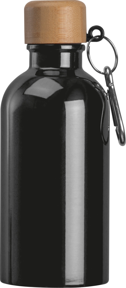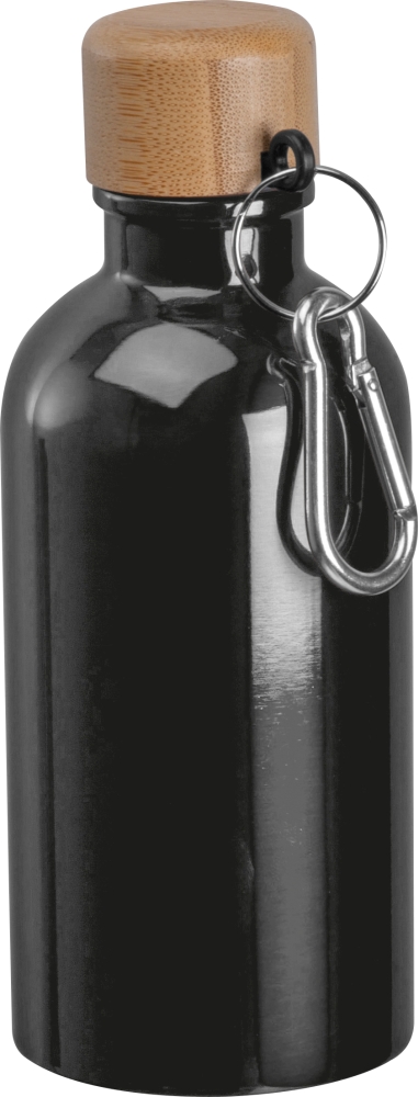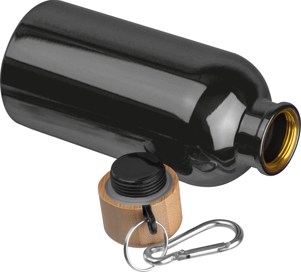 Small stainless steel drinking bottle with practical carabiner, a capacity of 400ml and a leak-proof screw cap with bamboo lid. We engrave your logo on the bottle Dimensions: o 6,5 x 17 cm