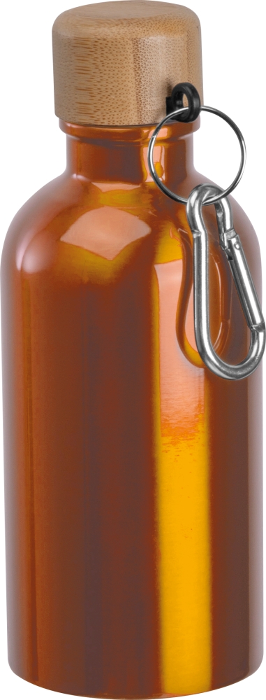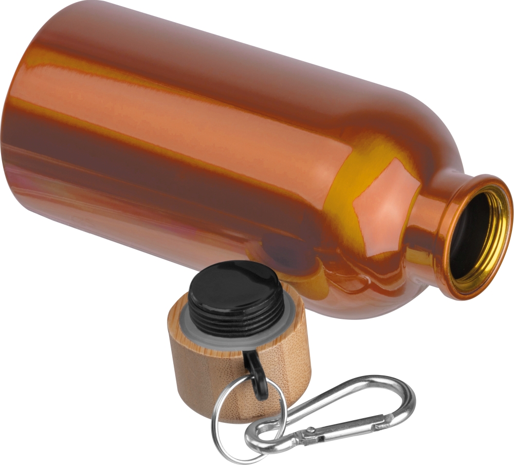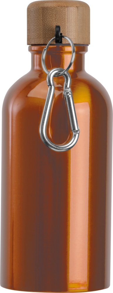 Small stainless steel drinking bottle with practical carabiner, a capacity of 400ml and a leak-proof screw cap with bamboo lid. We engrave your logo on the bottle Dimensions: o 6,5 x 17 cm