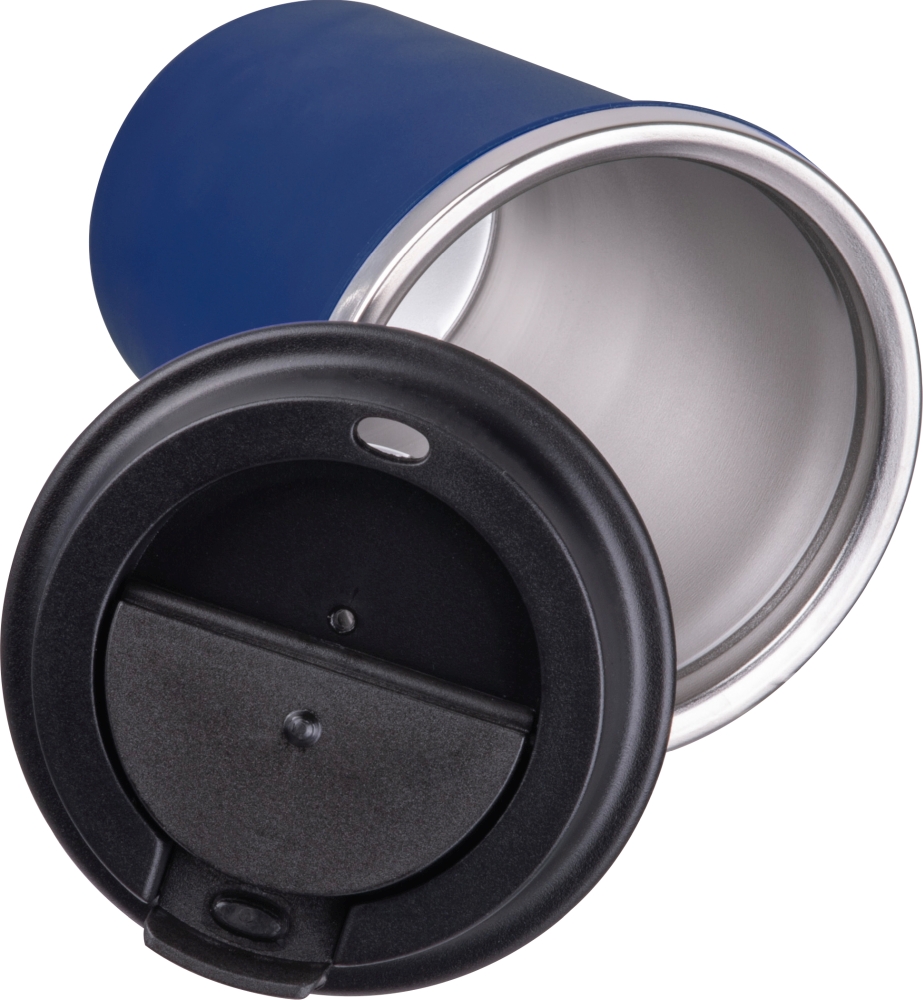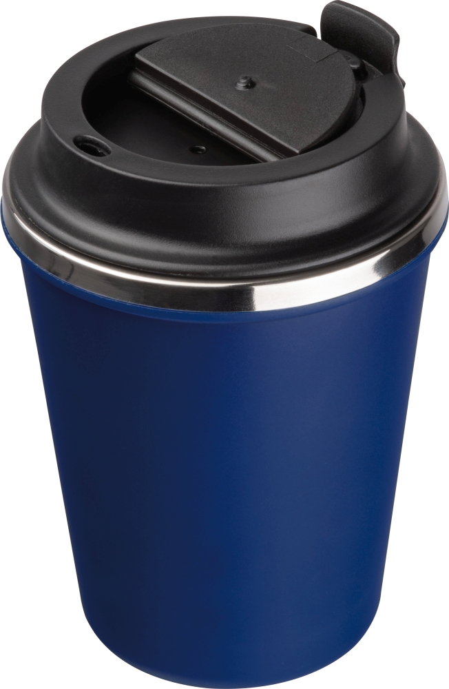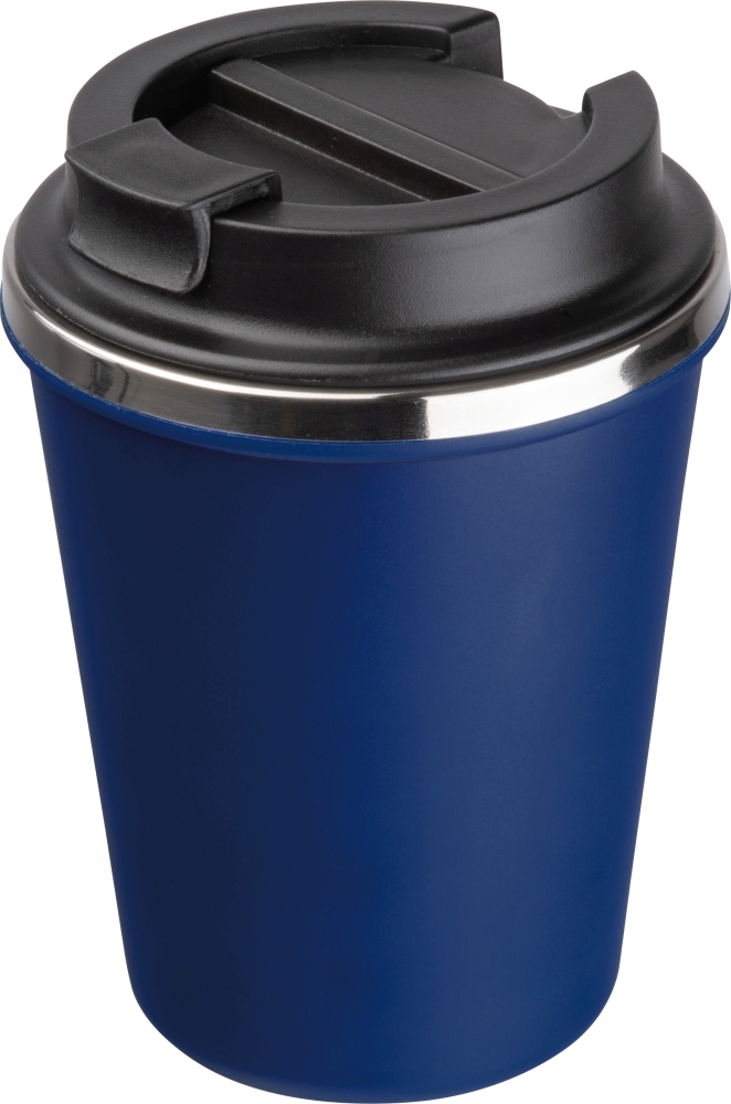 Double-walled drinking cup with a stainless steel interior and a recycled plastic exterior. Filling capacity of 350ml and a leak-proof screw cap with lockable drinking opening. We engrave your logo on the cup. Dimensions: o 9,2 x 12,9 cm