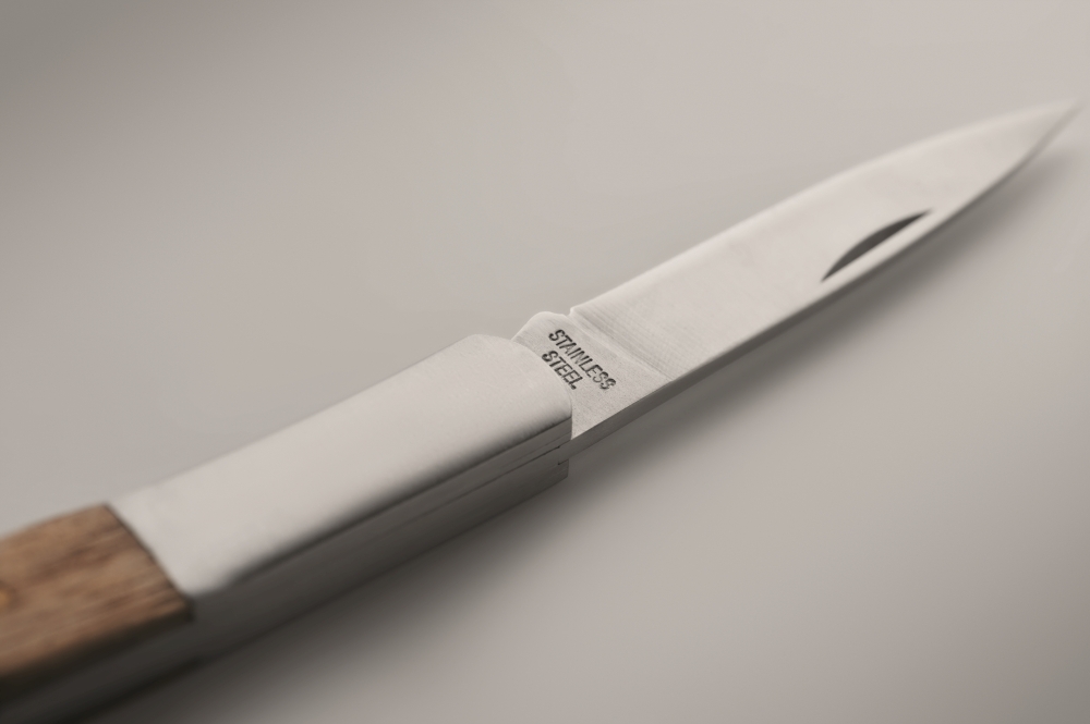 Stainless steel foldable knife in acacia wooden handle. Blade length: 6 cm. Dimensions: 9,1 x 2,4 x 1,4 cm